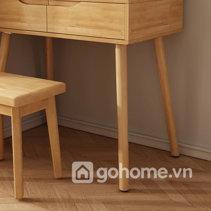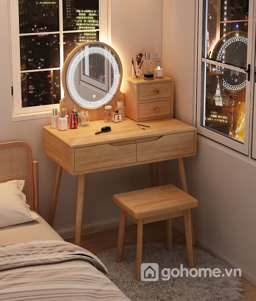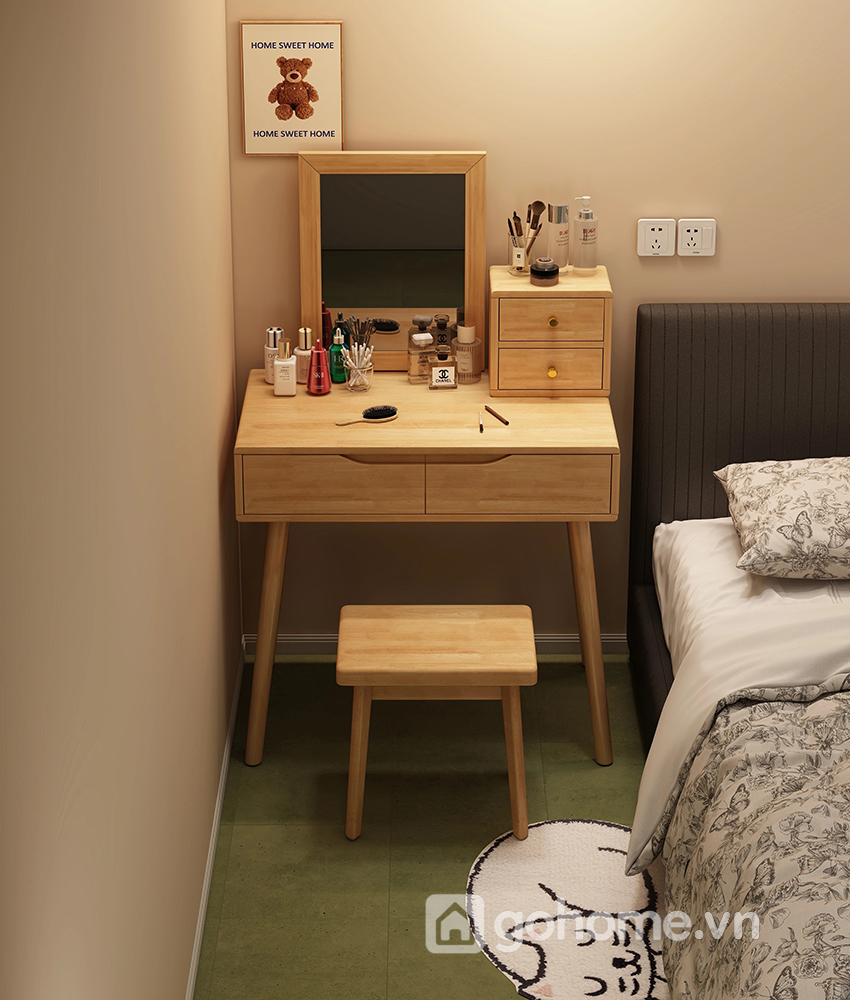 Ngoài ra, bàn được trang bị hai ngăn kéo trượt êm, cùng hộc nhỏ bên hông để sắp xếp đồ trang điểm hoặc phụ kiện gọn gàng.