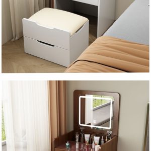 Không cầu kỳ hoa mỹ, không chiếm nhiều diện tích, mẫu bàn trang điểm này nổi bật nhờ thiết kế đóng/mở linh hoạt, tích hợp đầy đủ gương, ngăn kéo, kệ mỹ phẩm – tất cả trong một khối nhỏ gọn nhưng cực kỳ tiện dụng. Đặc biệt, phần ghế ngồi còn có thể tận dụng như hộc chứa đồ!