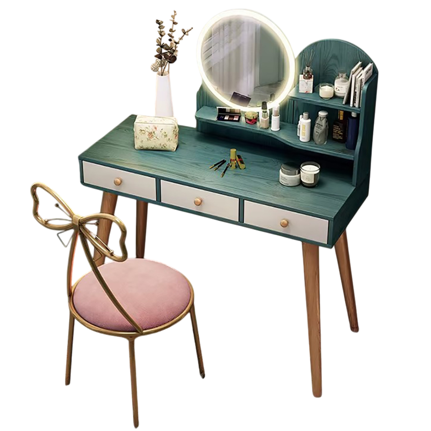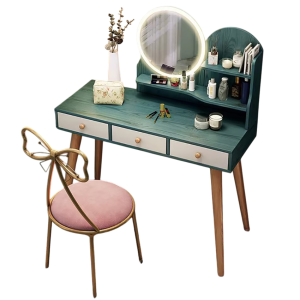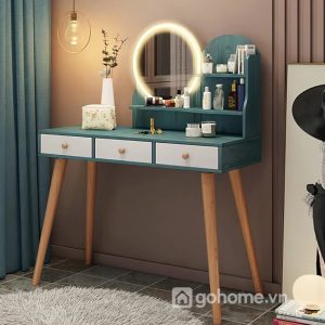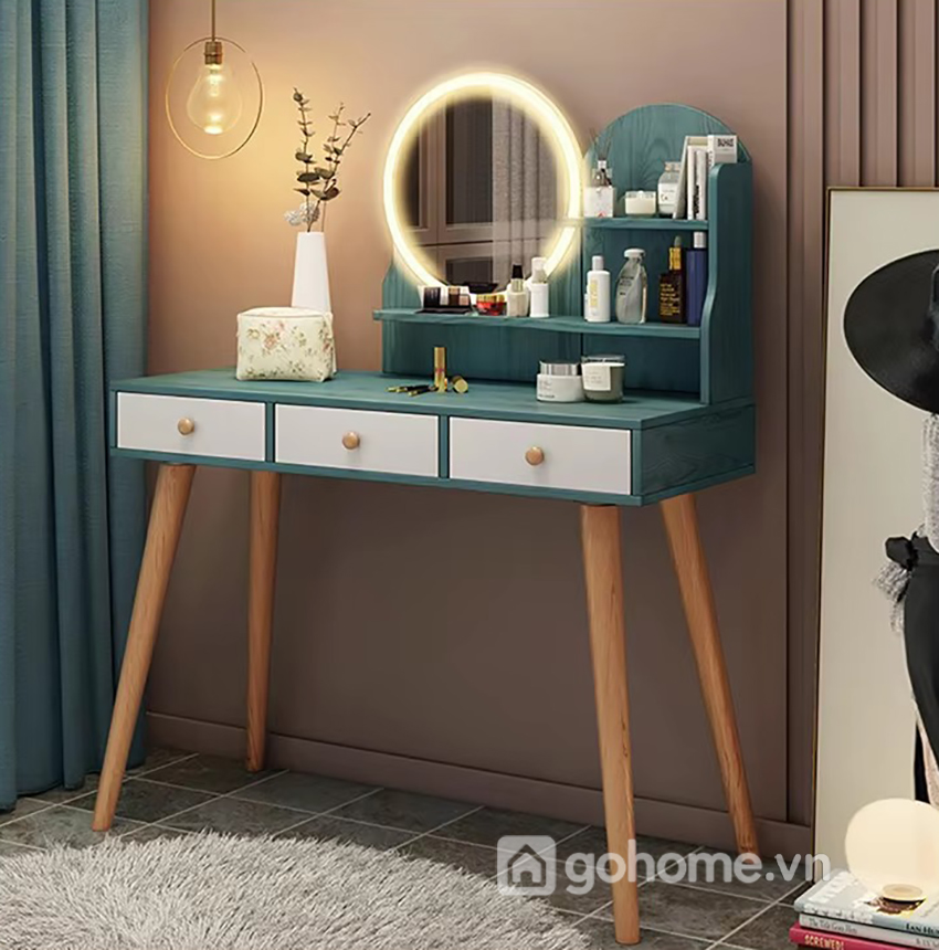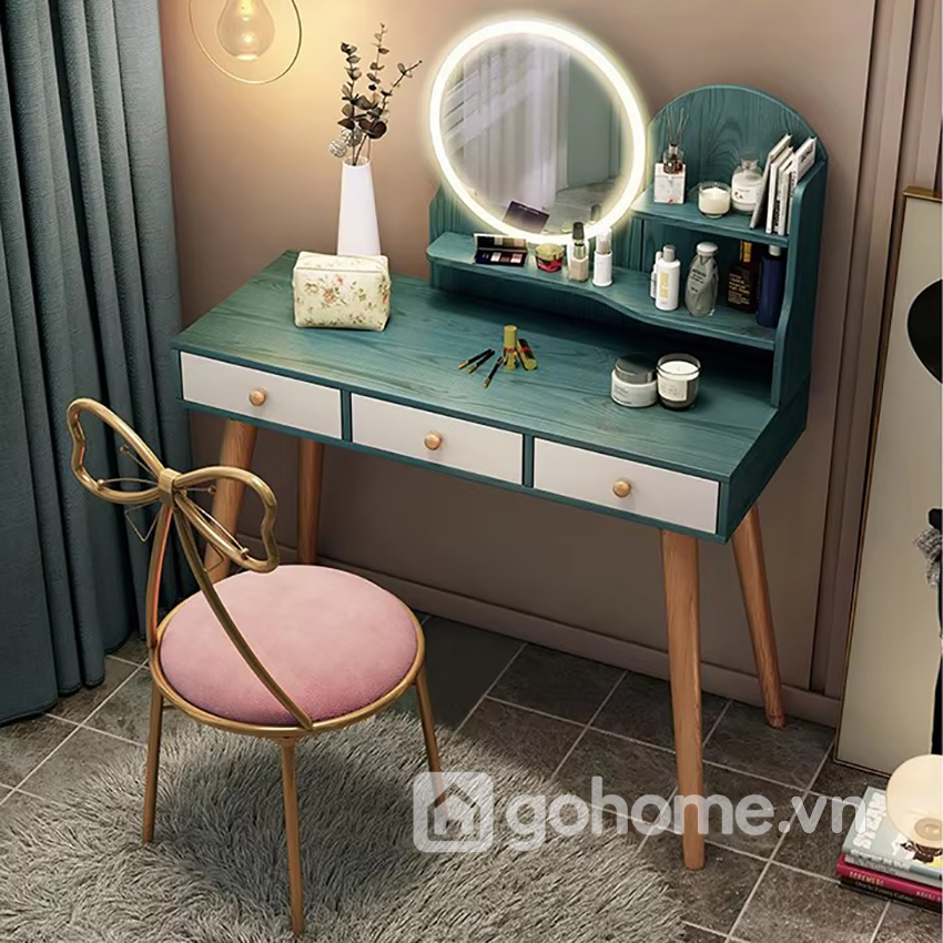 Chiếc bàn với thiết kế tone xanh ngọc hiện đại, chân gỗ chắc chắn, gương tròn đèn LED và ghế ngồi hoa văn cách điệu không chỉ làm đẹp cho bạn, mà còn “tỏa sáng” cả không gian phòng ngủ.