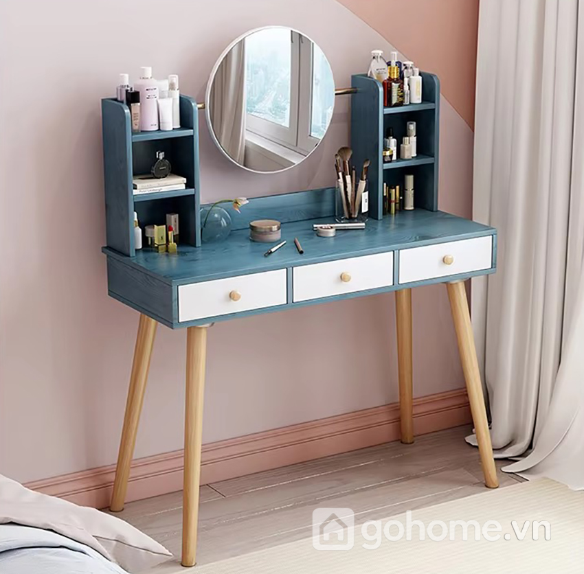 Mang phong cách giao thoa giữa nét mềm mại của Hàn Quốc và sự mộc mạc hiện đại của Bắc Âu, bàn trang điểm được thiết kế nhỏ gọn nhưng vô cùng tinh tế. Sự phối màu xanh ngọc – trắng cùng chất liệu gỗ vân nổi tự nhiên tạo nên hiệu ứng thẩm mỹ cao, dễ dàng kết hợp với nhiều không gian nội thất từ vintage đến hiện đại.