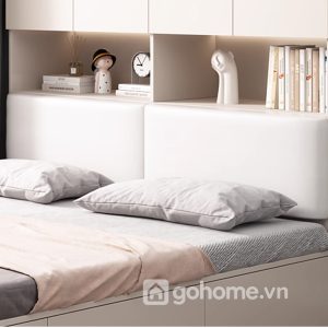Đệm đầu giường bọc da/mút tone trắng kem mềm mại, tạo cảm giác thư giãn khi tựa lưng đọc sách hoặc làm việc. Giường được làm từ gỗ MDF lõi xanh chống ẩm, kết cấu chắc chắn – chịu lực tốt, phù hợp sử dụng lâu dài cho cả người lớn và trẻ em.