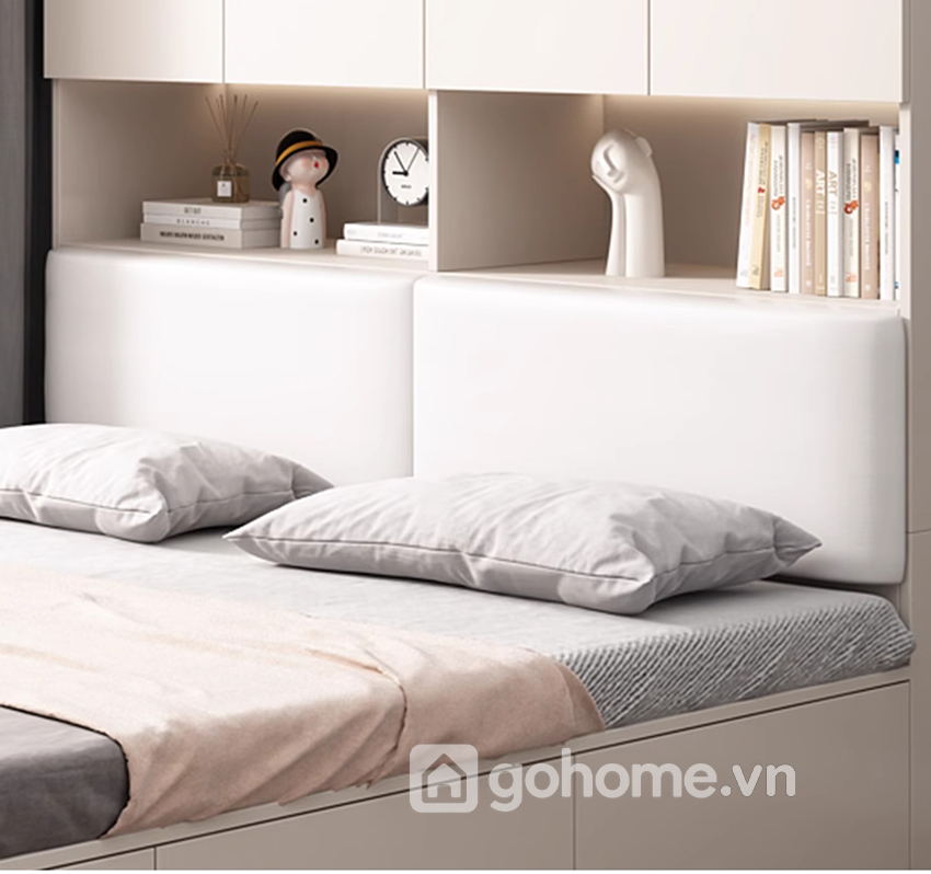 Một điểm cộng lớn là khoảng hở trang trí ngay trên đầu giường, tích hợp thêm các kệ mở giúp bạn trưng bày đồng hồ, sách, đèn ngủ, tượng decor… tạo điểm nhấn thẩm mỹ và cá nhân hóa không gian sống.