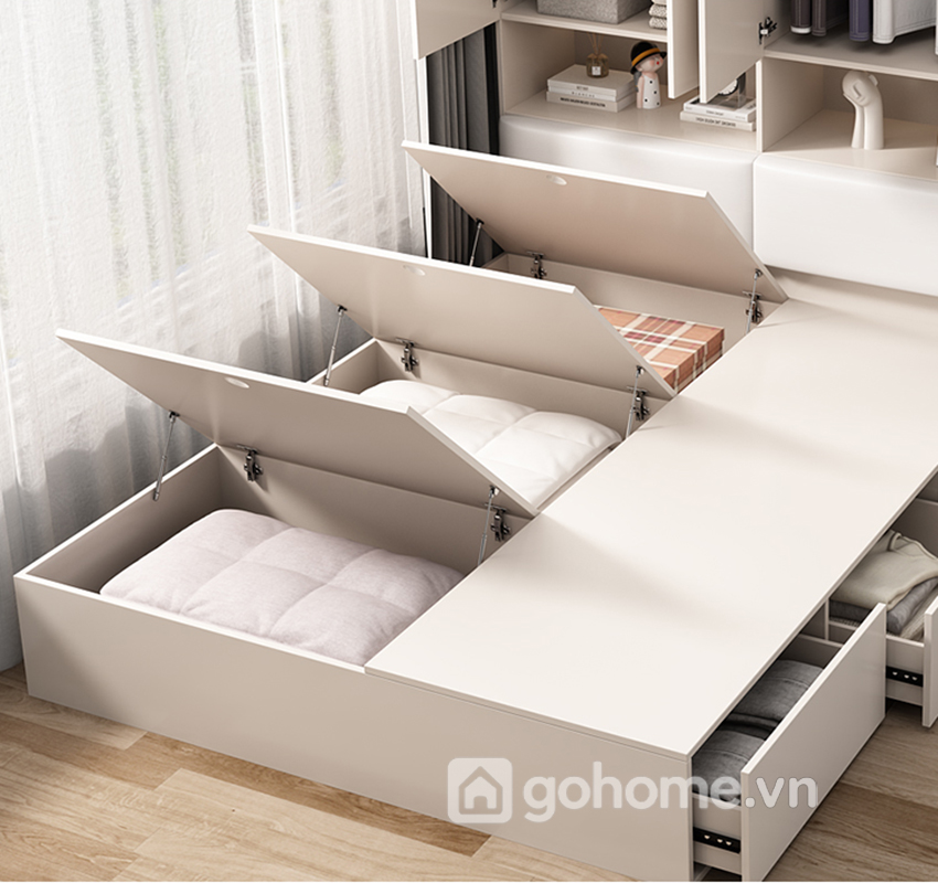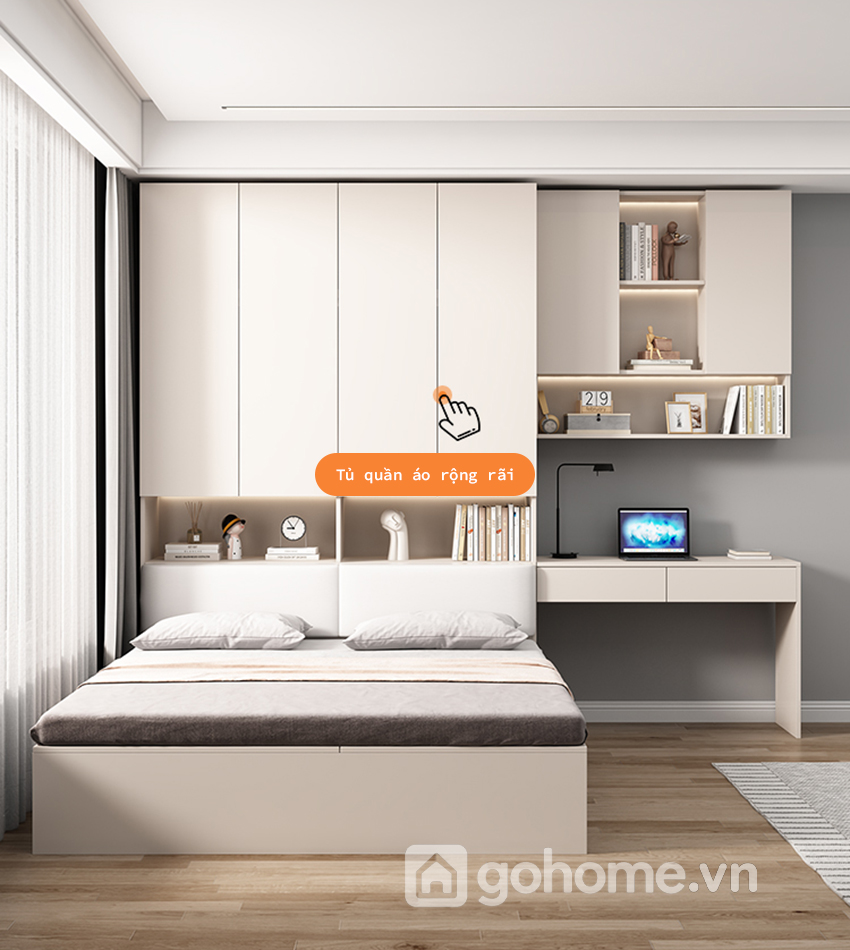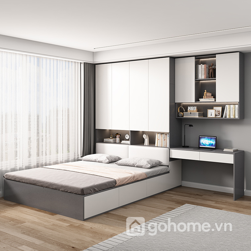 Không cần phải đau đầu suy nghĩ mua từng món nội thất riêng lẻ. Combo giường hộp kèm tủ áo rộng rãi kết hợp bàn làm việc tiện lợi là giải pháp hoàn hảo cho những ai muốn: