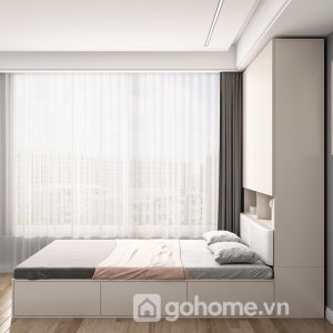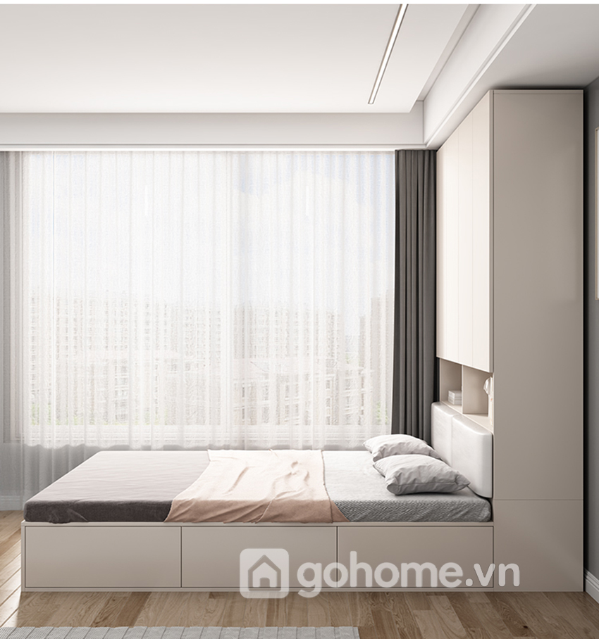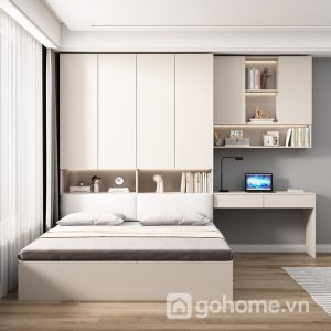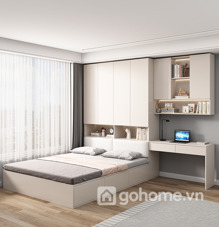 Tổng thể thiết kế của combo giường hộp – tủ áo – bàn làm việc này mang đậm chất Modern Minimalist: nhẹ nhàng, tinh tế, không rối mắt. Tông màu kem nhạt – be chủ đạo kết hợp cùng ánh sáng tự nhiên từ cửa sổ giúp căn phòng luôn sáng sủa, ấm áp và tràn đầy năng lượng.