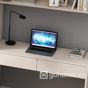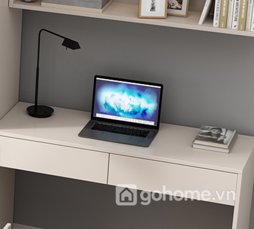 Phía trên là hệ kệ sách treo tường, nơi bạn có thể đặt tài liệu, sách yêu thích hoặc các món đồ trang trí nhỏ. Từng chi tiết được cân đối chuẩn chiều cao, giúp bạn ngồi làm việc lâu mà không bị mỏi cổ hay đau lưng.