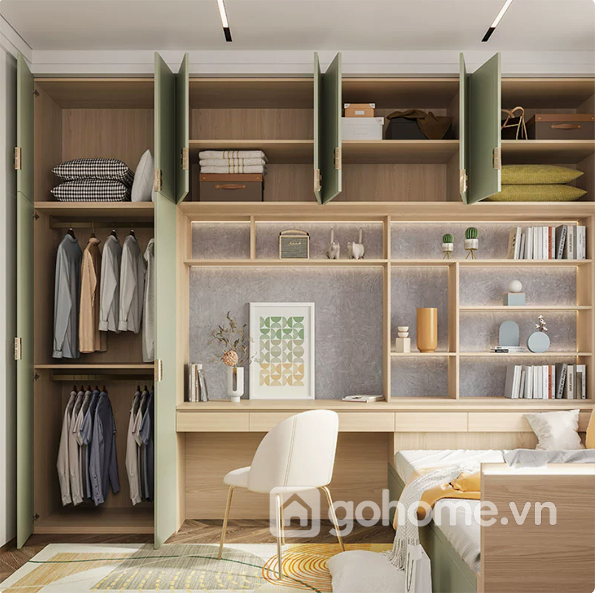 Thay vì phải sắm riêng từng món như giường ngủ, tủ áo, bàn học, giá sách khiến phòng ngủ chật chội và thiếu sự đồng bộ, thì nay bạn chỉ cần một giải pháp duy nhất: giường ngủ kèm giá sách, tủ quần áo và bàn làm việc – “combo nội thất thông minh” đang làm mưa làm gió trong thiết kế nội thất hiện đại.