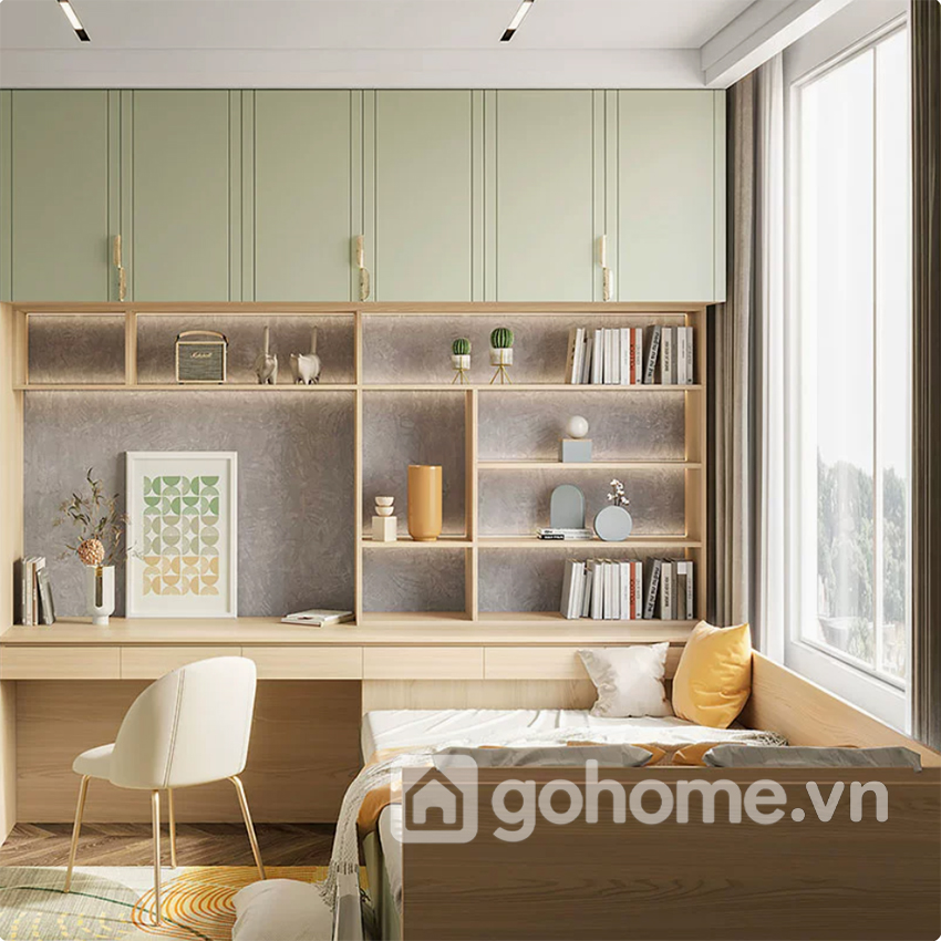 Ngay từ ánh nhìn đầu tiên, mẫu giường ngủ kèm giá sách, tủ quần áo và bàn làm việc chinh phục người xem nhờ thiết kế tinh tế, tông màu pastel kết hợp vân gỗ vô cùng nhẹ nhàng, phù hợp với mọi không gian: