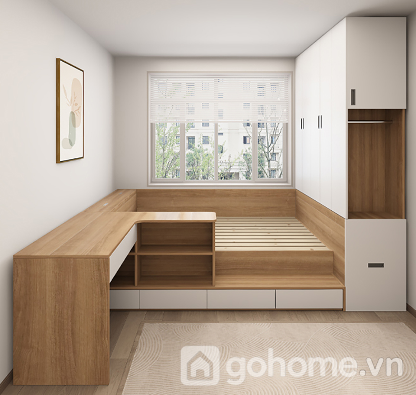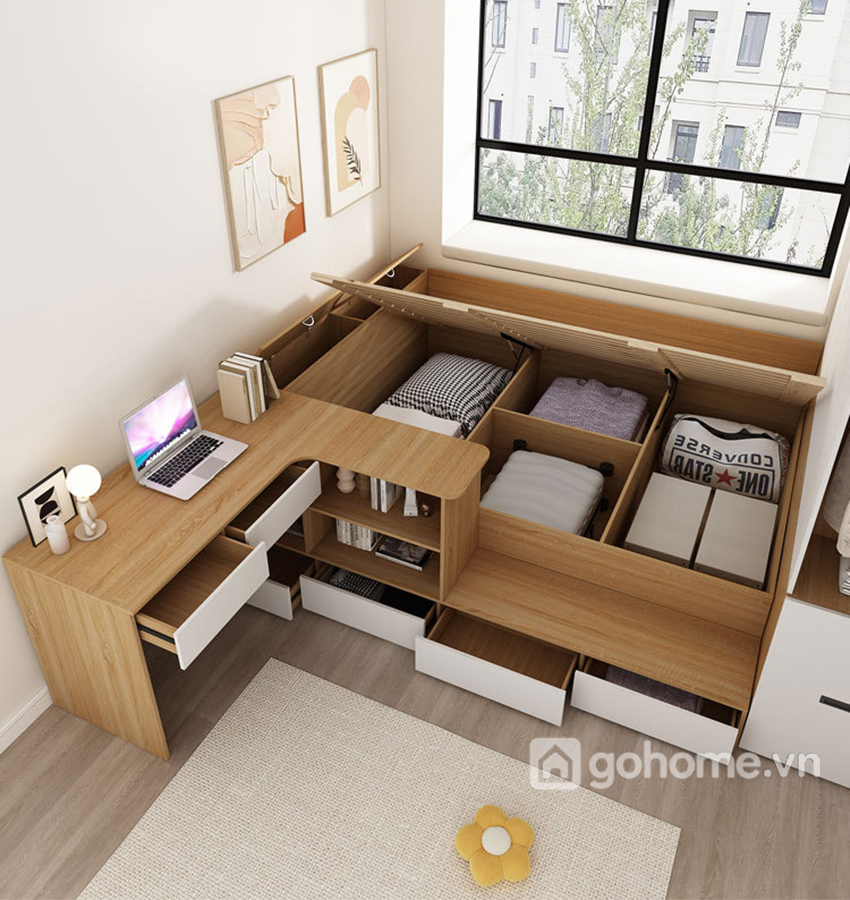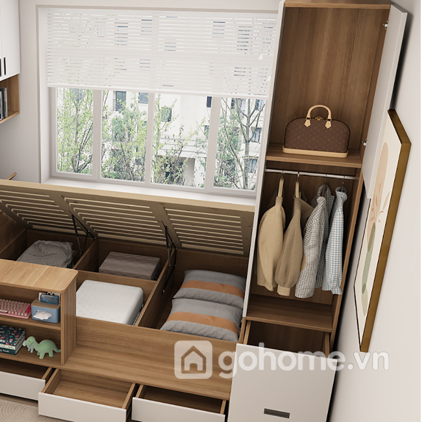 Phần giường được thiết kế nâng bậc như bục ngồi, giúp vừa là nơi nghỉ ngơi, vừa là nơi chứa đồ lý tưởng. Phía dưới giường có hệ ngăn kéo rộng, dễ dàng mở ra để cất chăn gối, đồ dùng không thường xuyên sử dụng, giày dép hoặc vali nhỏ.