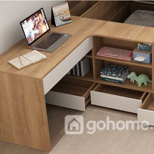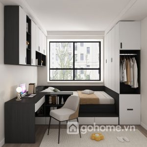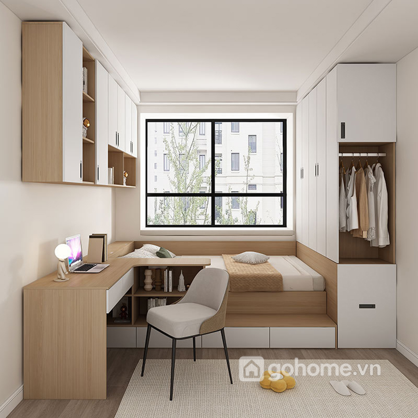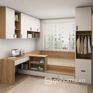Bàn học được thiết kế theo hình chữ L gọn gàng, kết nối liền mạch với thân giường và hệ tủ. Thiết kế này giúp tạo góc học tập – làm việc riêng biệt nhưng vẫn liên kết liền khối với toàn bộ nội thất, tiết kiệm diện tích tuyệt đối.
