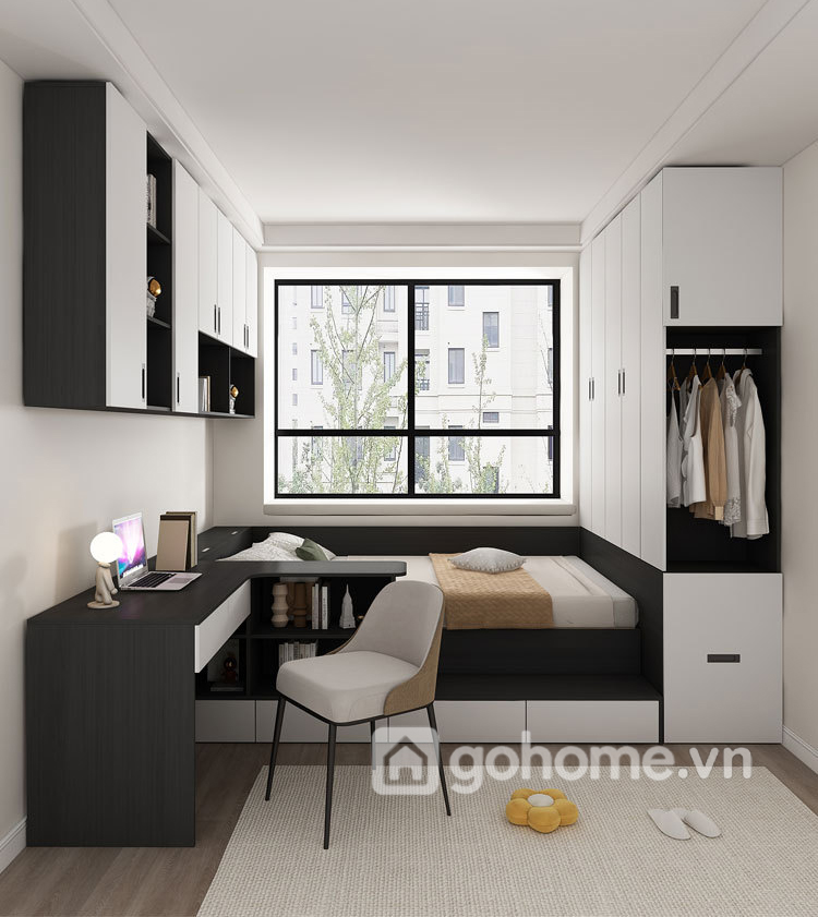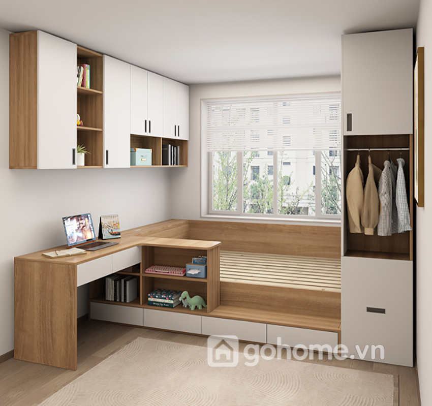 Với thiết kế thông minh, mẫu giường ngủ tích hợp tủ quần áo, kệ treo và bàn học này tạo nên một tổ hợp nội thất liền khối hoàn hảo. Không còn sự rời rạc giữa từng món nội thất, mà là một hệ thống đồng nhất, giúp căn phòng trở nên gọn gàng, rộng rãi và thẩm mỹ hơn nhiều lần.