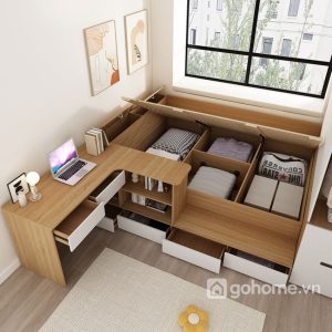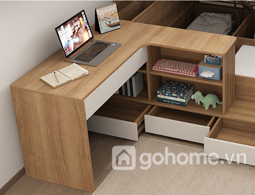 Phía dưới bàn có ngăn tủ kéo, giá sách nhỏ, bên trên là mặt bàn rộng rãi đủ để đặt laptop, đèn bàn, sách vở và vật dụng học tập. Rất lý tưởng cho: