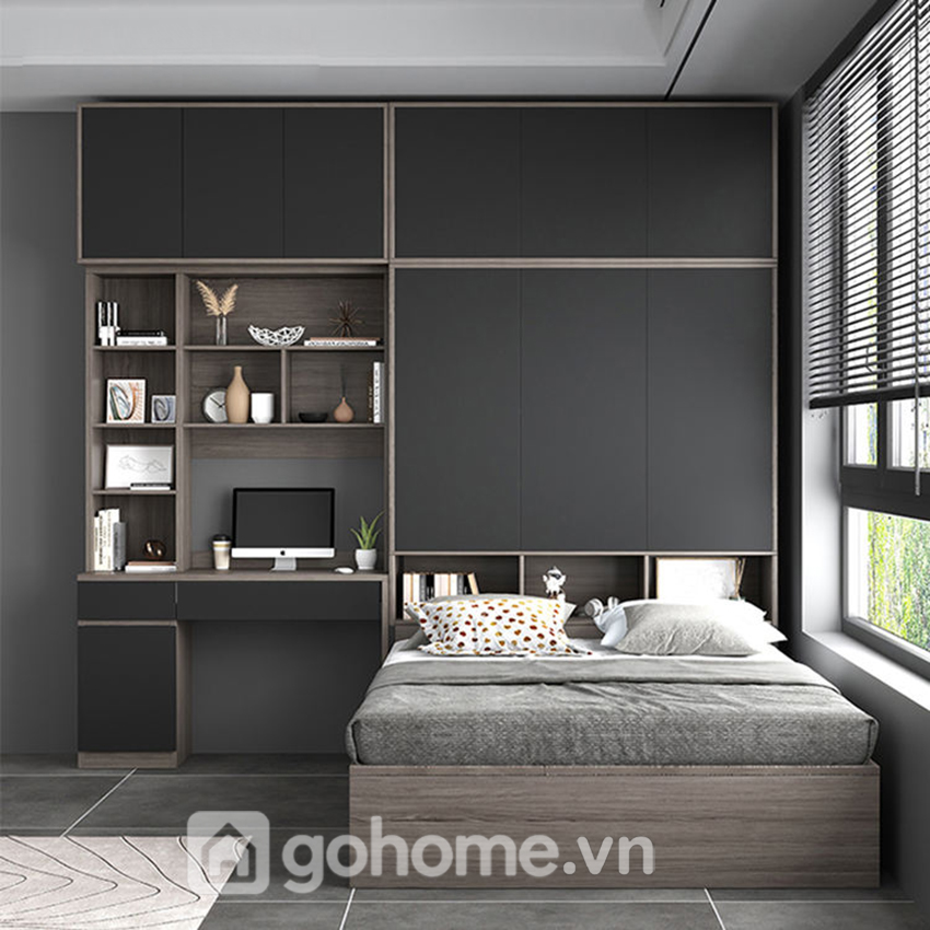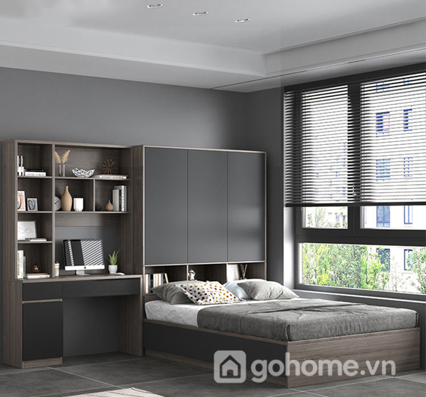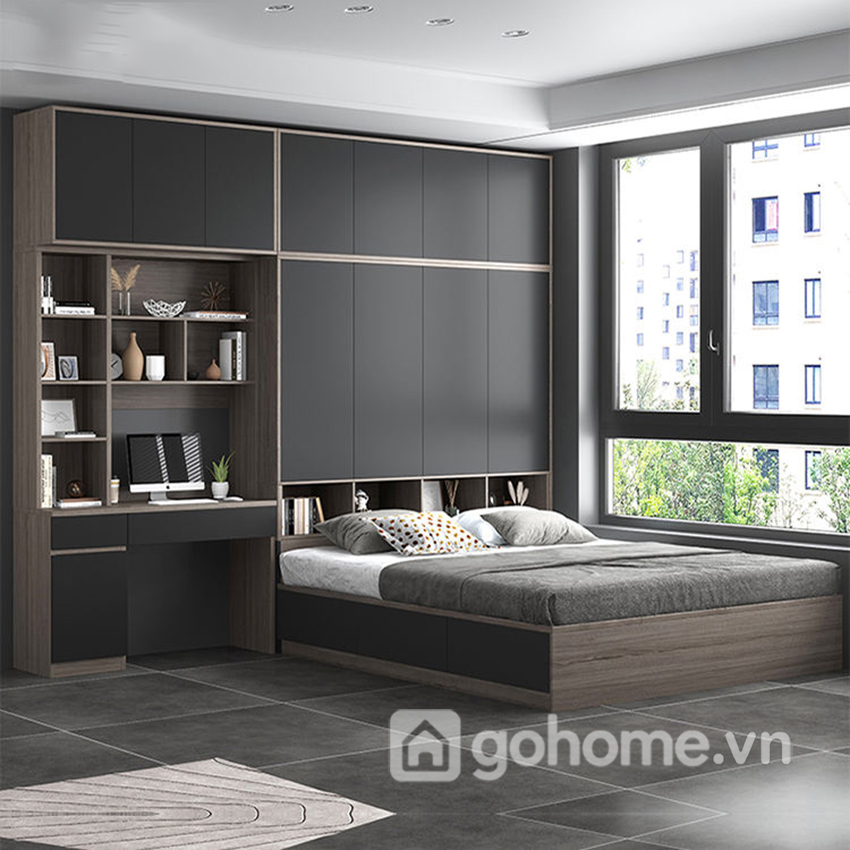 Mẫu giường ngủ kèm tủ quần áo và bàn làm việc đầy đủ tiện ích gây ấn tượng ngay từ cái nhìn đầu tiên với tone màu xám đen – vân gỗ trầm đầy cá tính. Đây là một trong những tone màu nội thất “hot trend” 2024, thường thấy trong: