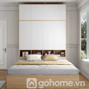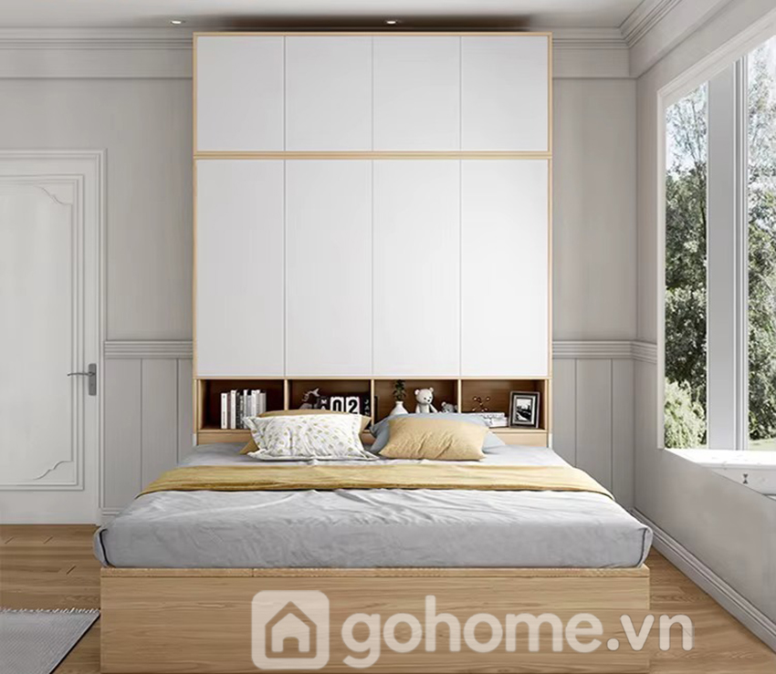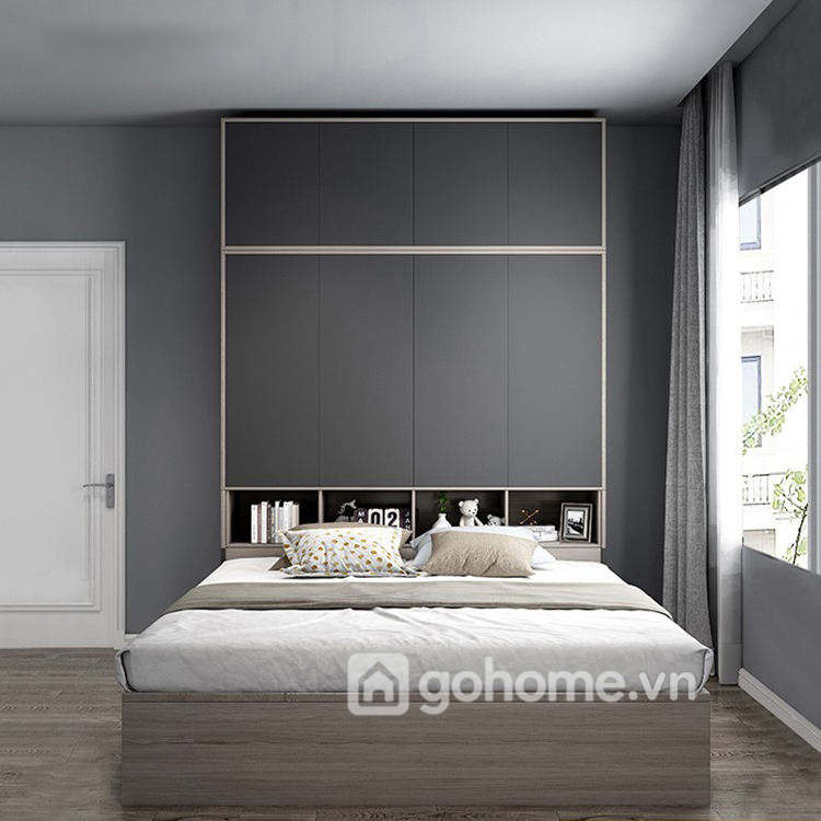Với kiểu thiết kế liền khối đồng bộ với đầu giường, tủ áo không chỉ tối ưu không gian lưu trữ mà còn tạo cảm giác liền mạch về thị giác, khiến căn phòng trở nên rộng rãi và sang trọng hơn.
