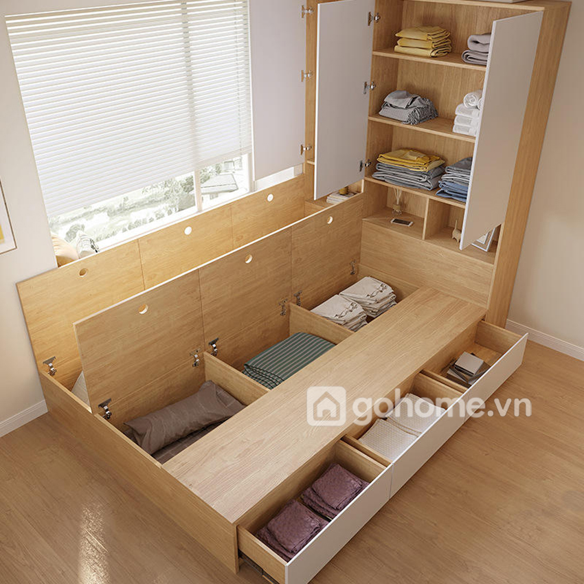 Khác với việc mua rời giường + tủ + hộc chứa, combo này liền khối – đồng bộ giúp:
