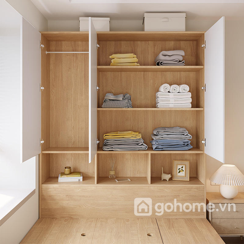 - Kết hợp các ngăn treo, ngăn gập, hộc mở – giúp phân loại quần áo, phụ kiện, đồ ít dùng.