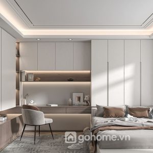 Toàn bộ hệ tủ được thiết kế sát tường, chạy liền mạch từ bàn học đến đầu giường, tối đa hóa khả năng lưu trữ mà vẫn mang tính thẩm mỹ cao. Đèn LED hắt sáng tinh tế giúp bé học tập hiệu quả và dễ chịu hơn khi đọc sách vào buổi tối.