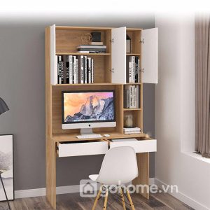 Chiều cao tiêu chuẩn, mặt bàn rộng rãi đủ để làm việc với máy tính, sổ tay, đèn học,… Bên cạnh đó là các hộc tủ nhỏ để cất giữ tài liệu, phụ kiện công nghệ hoặc sách vở.