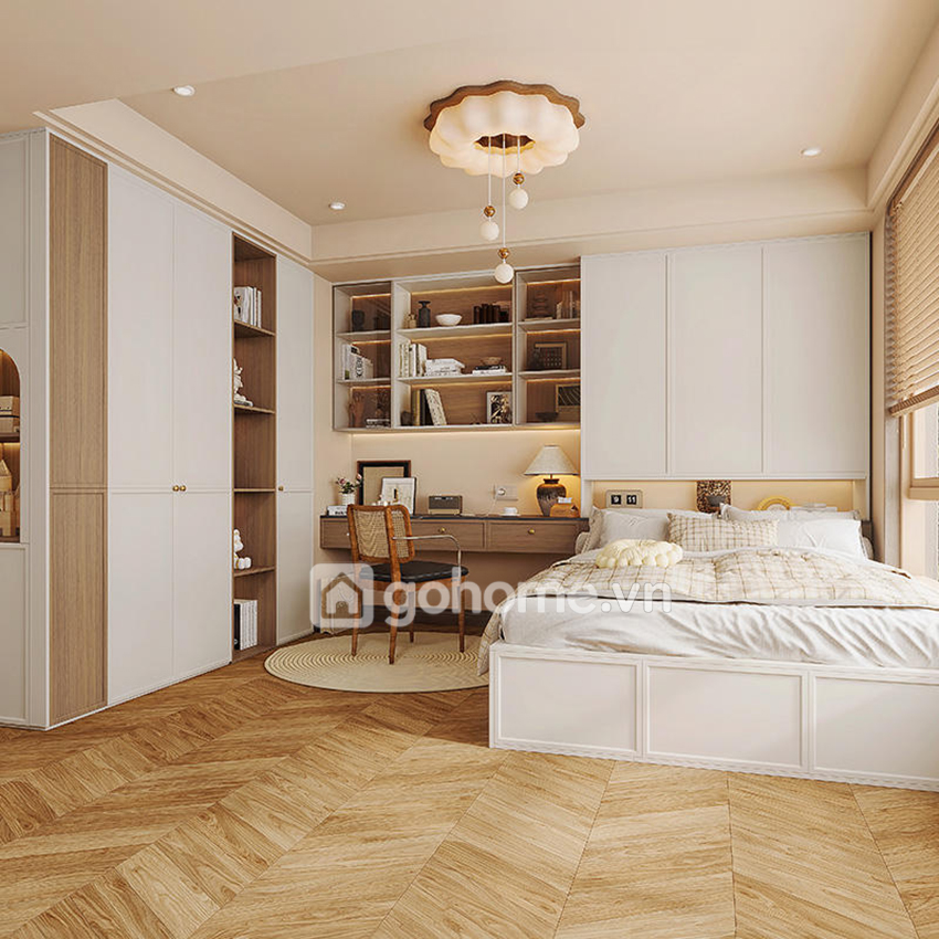 Ngay từ cái nhìn đầu tiên, combo giường ngủ kết hợp tủ quần áo và bàn trang điểm này “đốn tim” người dùng bởi tone trắng – gỗ sáng thanh lịch. Đây là sự kết hợp màu sắc cực kỳ được ưa chuộng trong thiết kế nội thất hiện nay bởi: