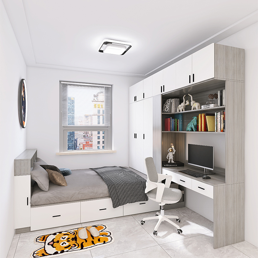 Mẫu combo giường – tủ – bàn học anh gửi mang hơi hướng Scandinavian hiện đại với tone màu trắng – xám nhạt trung tính, phù hợp với nhiều phong cách phòng khác nhau: từ phòng trẻ em, học sinh – sinh viên đến phòng người lớn yêu thích sự gọn gàng, nhẹ nhàng.