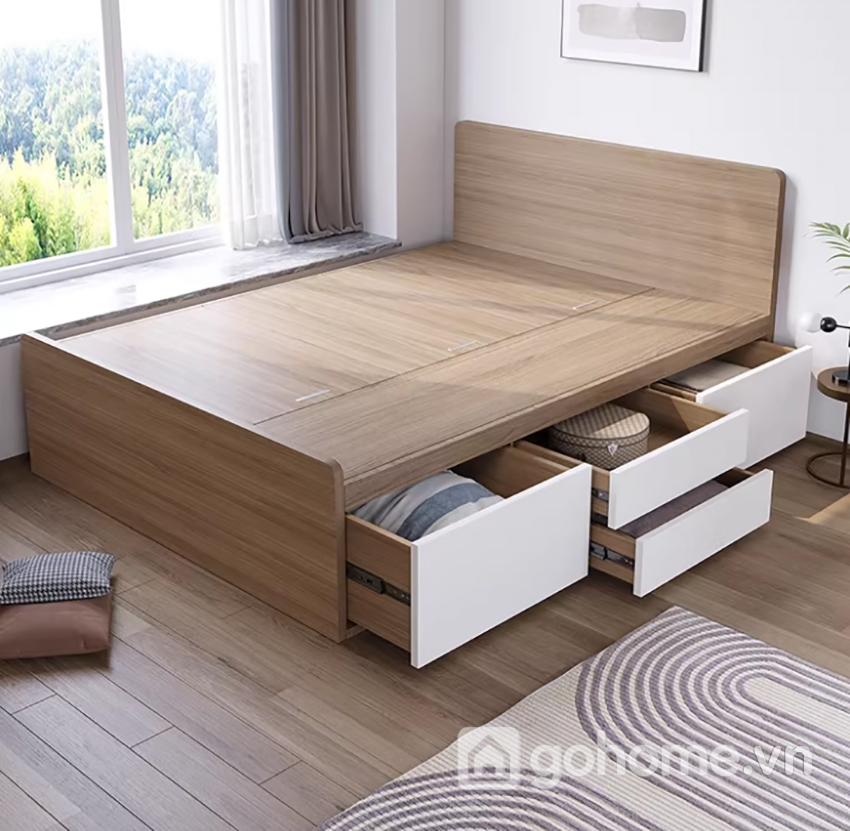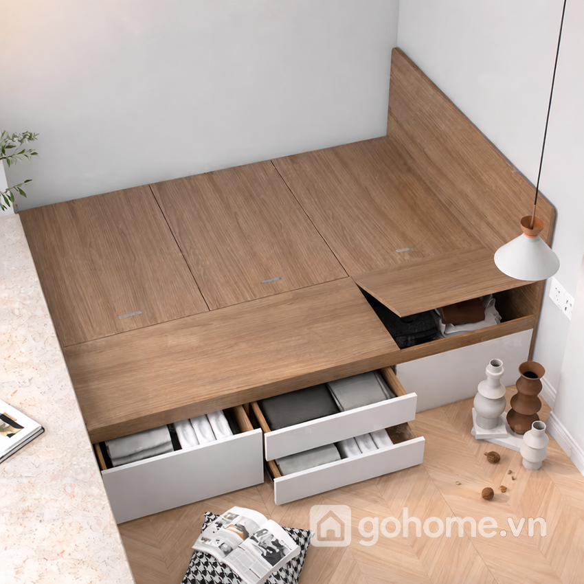 Với thiết kế dạng bục hộp chắc chắn kết hợp nhiều ngăn chứa đồ bên dưới, chiếc giường này không chỉ mang đến sự tiện nghi mà còn tạo nên phong cách nội thất tinh tế, gọn gàng. Đây là dòng giường ngủ thông minh có ngăn kéo, giường bục lưu trữ, giường ngủ tối giản kiểu Nhật đang được rất nhiều gia đình trẻ và căn hộ hiện đại lựa chọn.