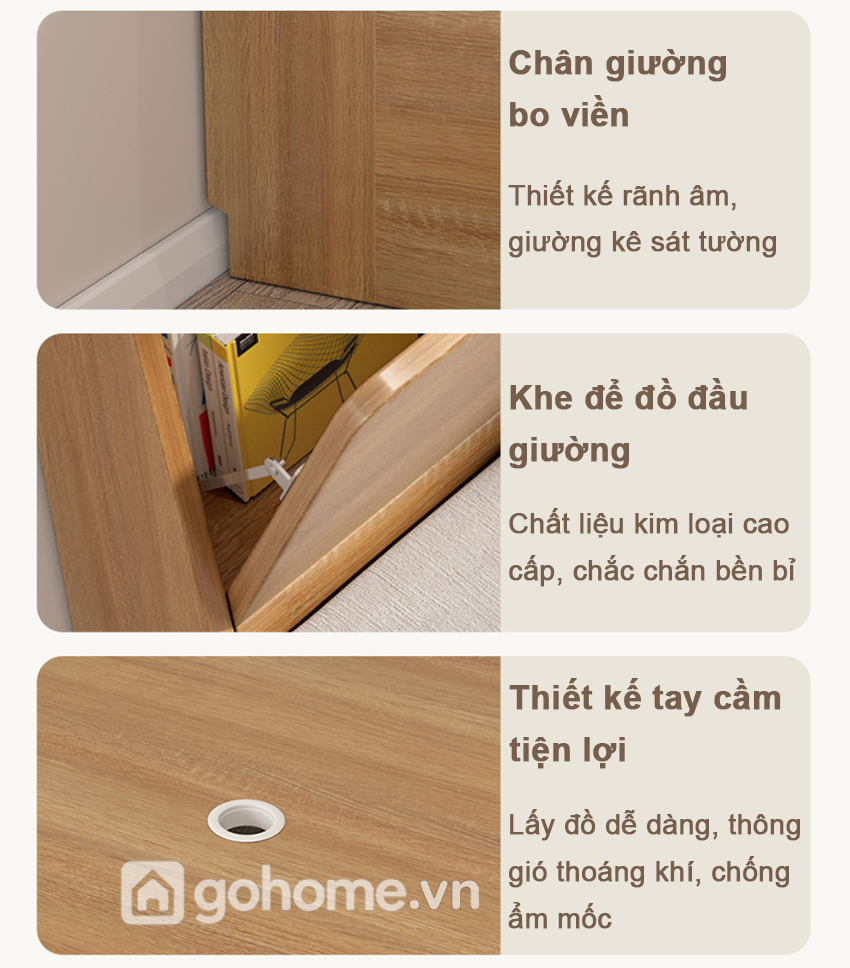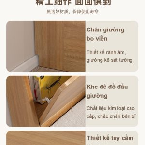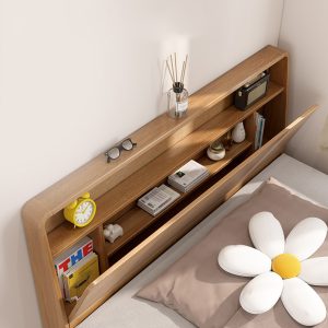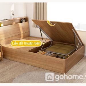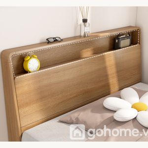 Đặc biệt, phần kệ nhỏ tích hợp đầu giường chính là điểm nhấn thông minh. Bạn có thể đặt đèn ngủ, sách đọc dở, lọ tinh dầu thư giãn hoặc các vật dụng cá nhân cần thiết ngay trong tầm tay – cực kỳ tiện lợi mà không cần thêm bàn đầu giường rườm rà.