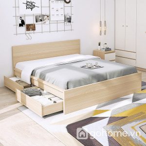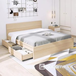 Thiết kế hiện đại, màu gỗ sáng tự nhiên cùng hệ thống ngăn kéo rộng rãi, chiếc giường này không chỉ mang đến giấc ngủ êm ái mà còn trở thành giải pháp lưu trữ thông minh, đặc biệt phù hợp với căn hộ chung cư và phòng ngủ diện tích vừa & nhỏ.