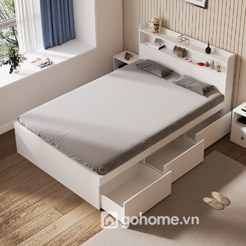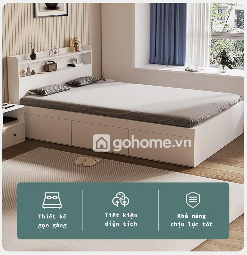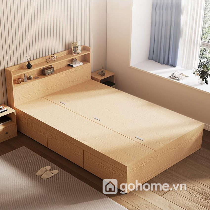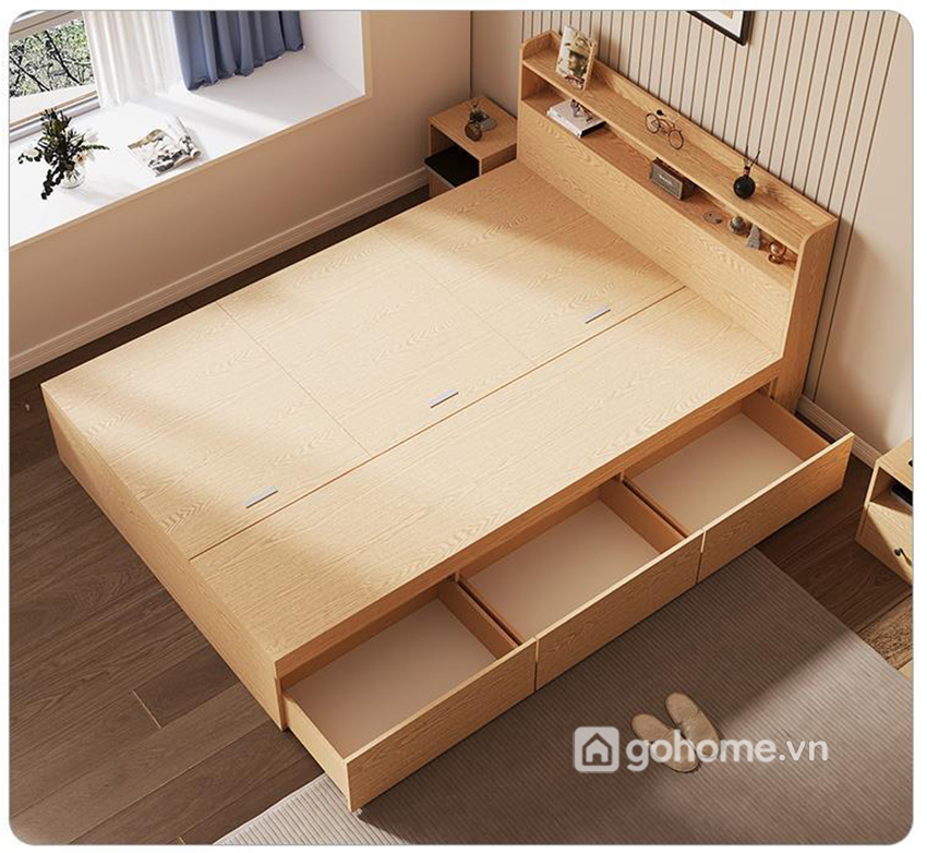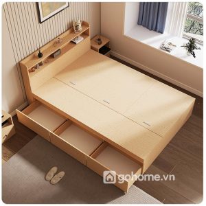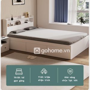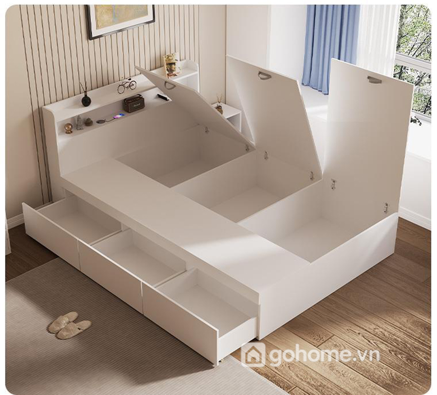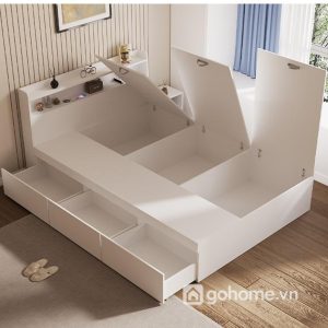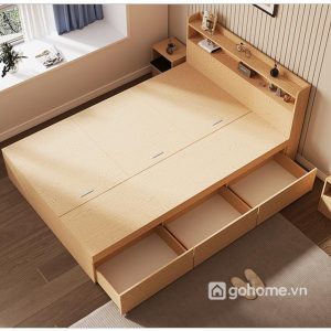 Bên cạnh đó, giường còn tích hợp nhiều ngăn kéo và hộc chứa đồ rộng rãi, tối ưu không gian sống – đặc biệt phù hợp cho những căn hộ chung cư, phòng ngủ diện tích nhỏ nhưng cần sự ngăn nắp và tiện lợi.