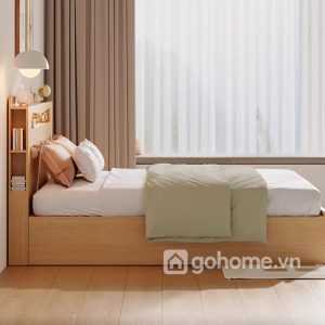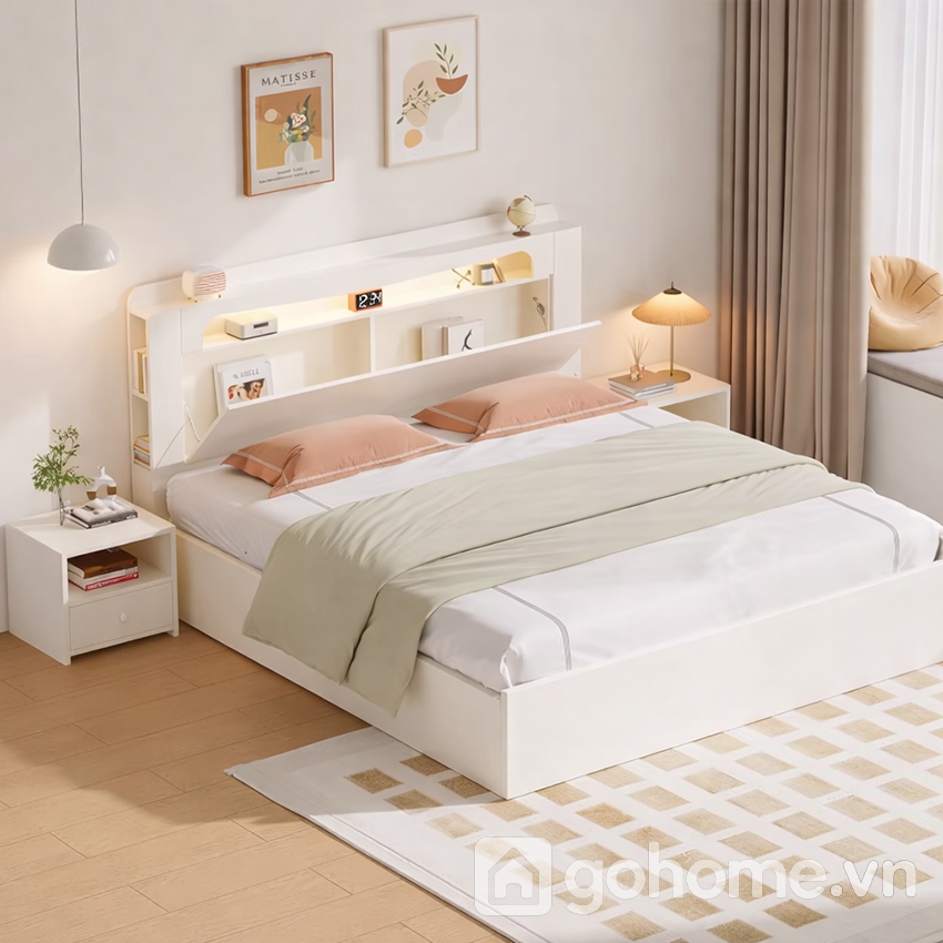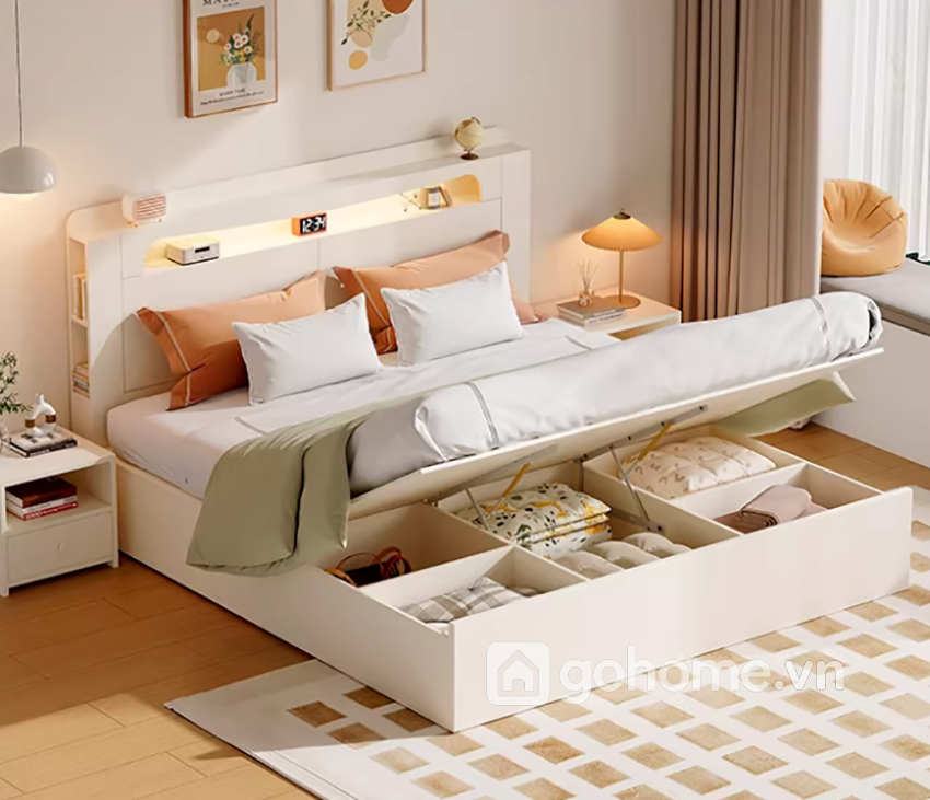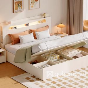 Với thiết kế hiện đại, khoang chứa đồ rộng rãi và nhiều tiện ích tích hợp, chiếc giường giúp phòng ngủ trở nên gọn gàng, tiện nghi và thẩm mỹ hơn.