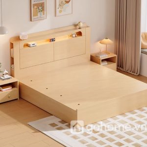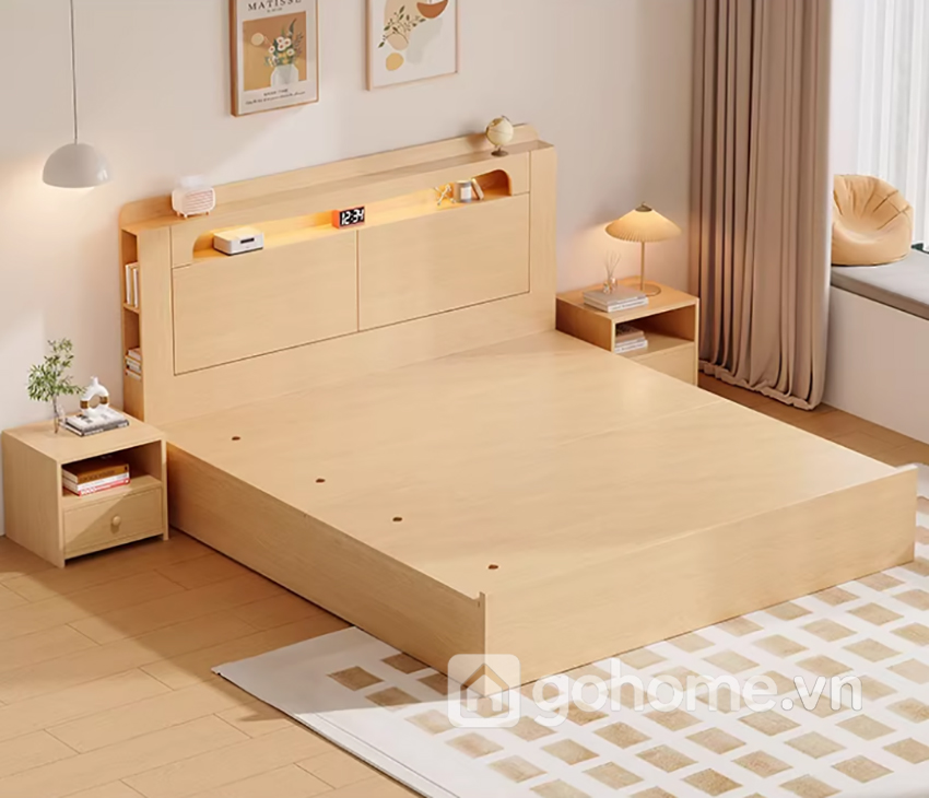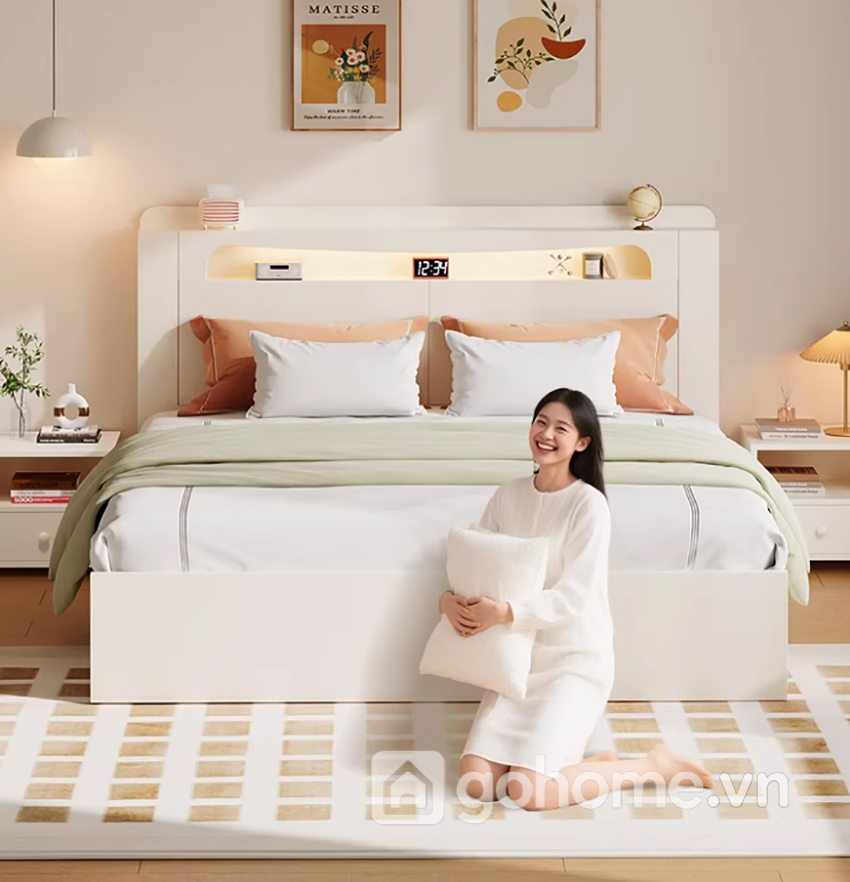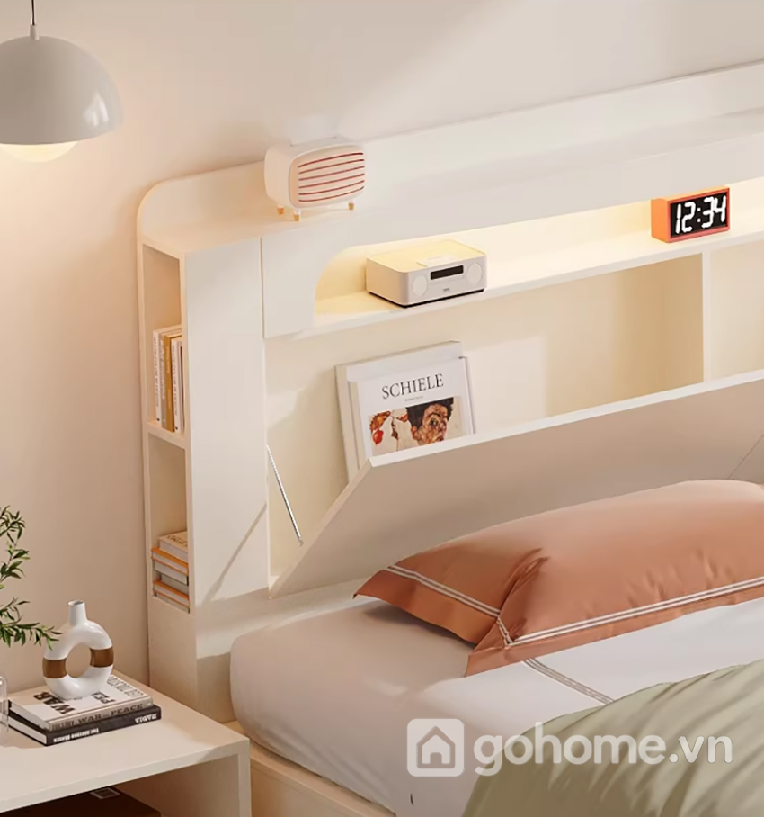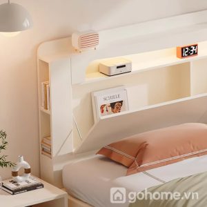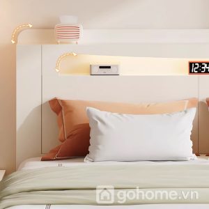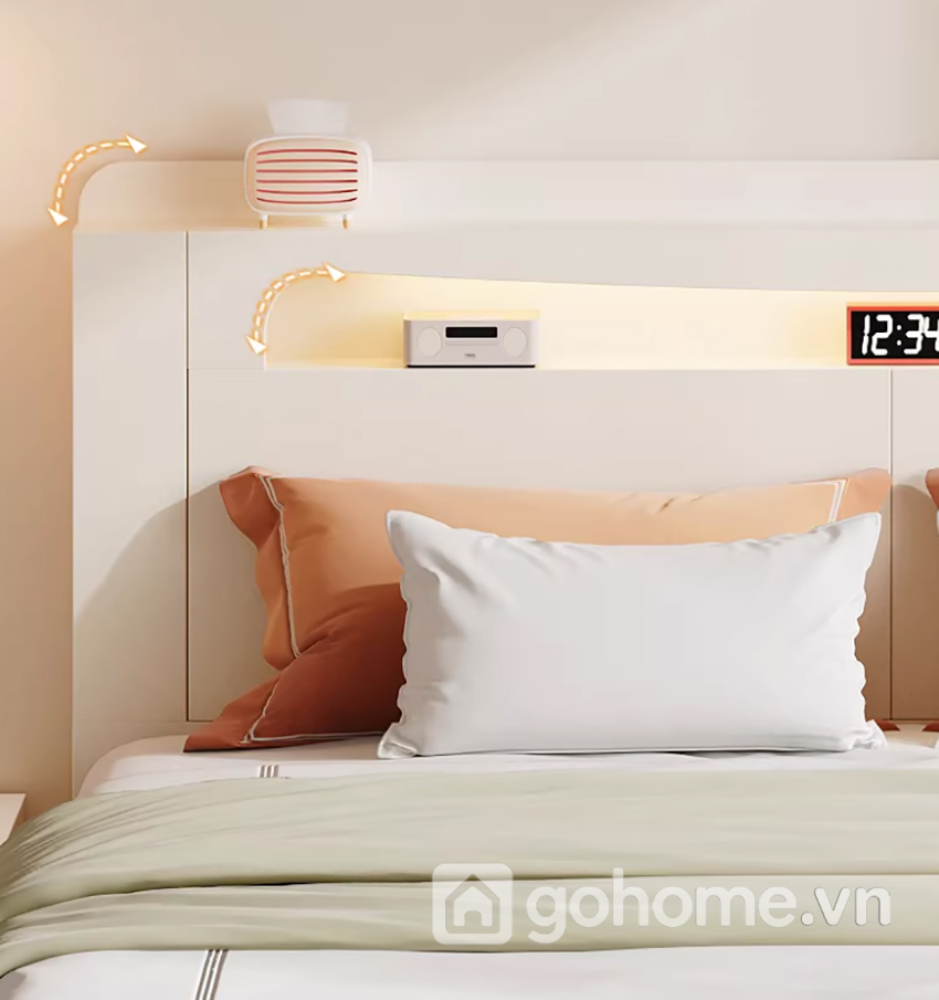 Phần đầu giường được thiết kế như một kệ trang trí nhỏ, tích hợp thêm đèn LED và khu vực đặt đồ cá nhân. Bạn có thể đặt sách, điện thoại, đồng hồ hoặc đồ decor mà không cần thêm tủ đầu giường cồng kềnh.