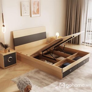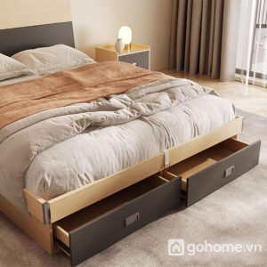 Điểm nhấn lớn nhất chính là ngăn kéo lưu trữ thông minh dưới gầm giường. Bạn có thể dễ dàng cất giữ chăn ga, gối, quần áo hoặc những vật dụng ít dùng đến, giúp phòng ngủ luôn gọn gàng, ngăn nắp mà không cần tốn thêm diện tích cho tủ kệ.