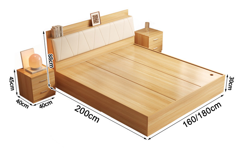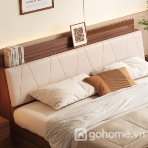 Chiếc giường gây ấn tượng với gam màu vân gỗ nâu trầm sang trọng, kết hợp cùng phần đầu giường bọc da đen tạo điểm nhấn tinh tế. Tổng thể thiết kế vuông vức, gọn gàng, phù hợp với các phong cách nội thất như Minimalism, Modern, Japandi.