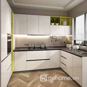 Hệ tủ sử dụng thiết kế cánh phẳng không tay nắm, tạo cảm giác gọn gàng và mạch lạc. Đặc biệt, những ô tủ phối màu xanh chanh nổi bật chính là điểm nhấn đắt giá giúp căn bếp trở nên sống động, trẻ trung và mang dấu ấn cá nhân.