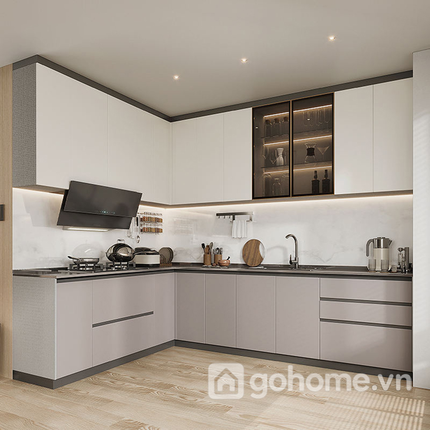 Không chạy theo phong cách rực rỡ hay cầu kỳ, mẫu tủ này sử dụng tone màu trung tính trắng – ghi – đen nhấn nhẹ tạo cảm giác sạch sẽ, hiện đại và phù hợp với mọi không gian kiến trúc. Gam màu này cũng cực kỳ “dễ tính” khi kết hợp với các thiết bị nhà bếp như: lò vi sóng, máy hút mùi, máy lọc nước, bếp từ hay bình đun siêu tốc – đảm bảo tổng thể hài hòa, đồng nhất. Gohome còn tùy chỉnh màu sắc để phù hợp với từng không gian phòng bếp của mọi gia đình