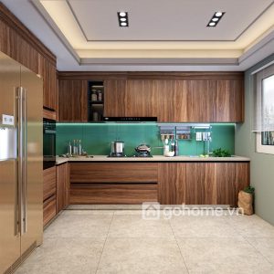 Với tông nâu gỗ trầm phối kính xanh ngọc làm điểm nhấn, tổng thể căn bếp vừa hiện đại vừa gần gũi – toát lên nét sang trọng khó nhầm lẫn.