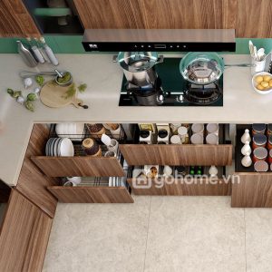 Khu lưu trữ: Ngăn kéo chia tầng cho nồi – chảo – bát đĩa, tủ cao đựng đồ khô, thiết bị điện