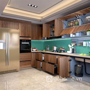 Toàn bộ hệ tủ sử dụng gỗ MDF lõi xanh chống ẩm, được phủ Melamine vân gỗ sậm sang trọng. Đây là chất liệu đặc biệt phù hợp với môi trường bếp: