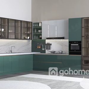 Không giống những gam màu tủ bếp truyền thống, hệ tủ này sử dụng màu xanh rêu đậm phối trắng sứ bóng gương – mang đến cảm giác vừa đẳng cấp, vừa thời thượng.