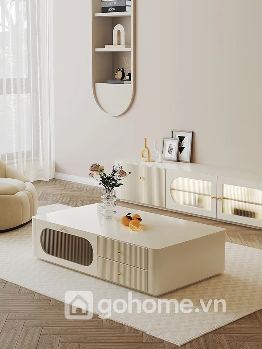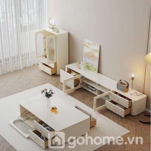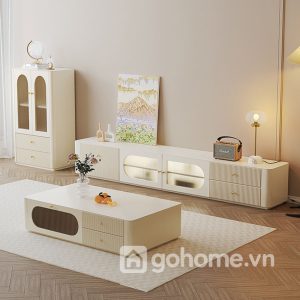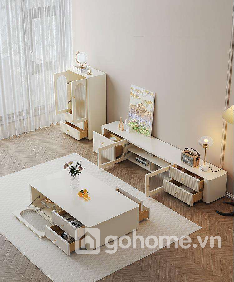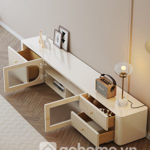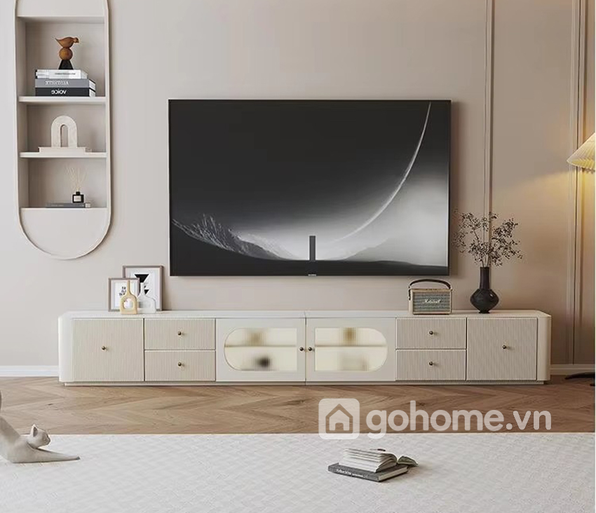 Không chỉ đẹp, kệ còn tối ưu công năng lưu trữ, phù hợp cho nhiều không gian phòng khách hiện đại.