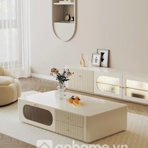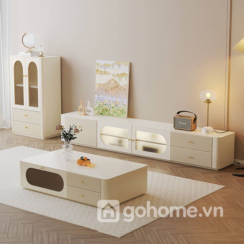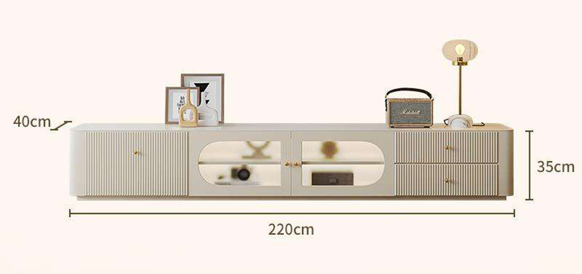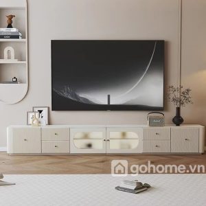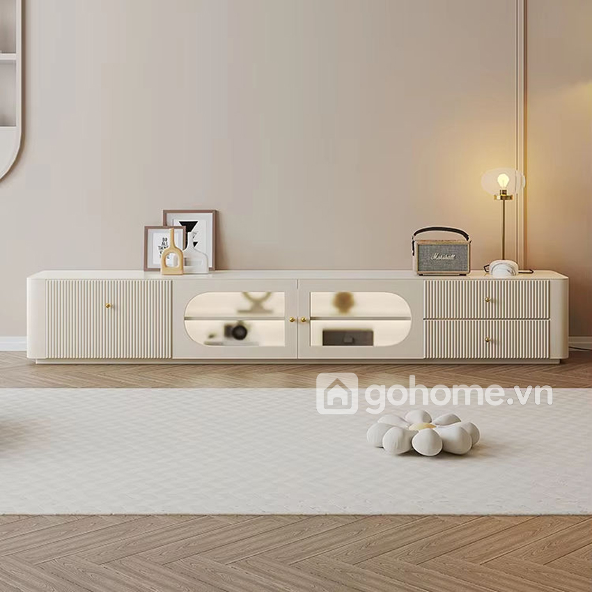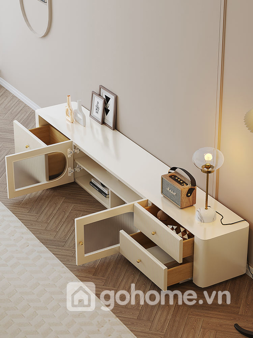 Mẫu kệ tivi kết hợp cánh kính mờ là lựa chọn hoàn hảo cho khách hàng yêu thích phong cách tinh gọn, sang trọng và nhẹ nhàng. Thiết kế đối xứng, kết hợp thêm những đường vân dọc tinh tế và cánh kính mờ bo cong độc đáo giúp tổng thể trở nên nổi bật nhưng không hề phô trương.
