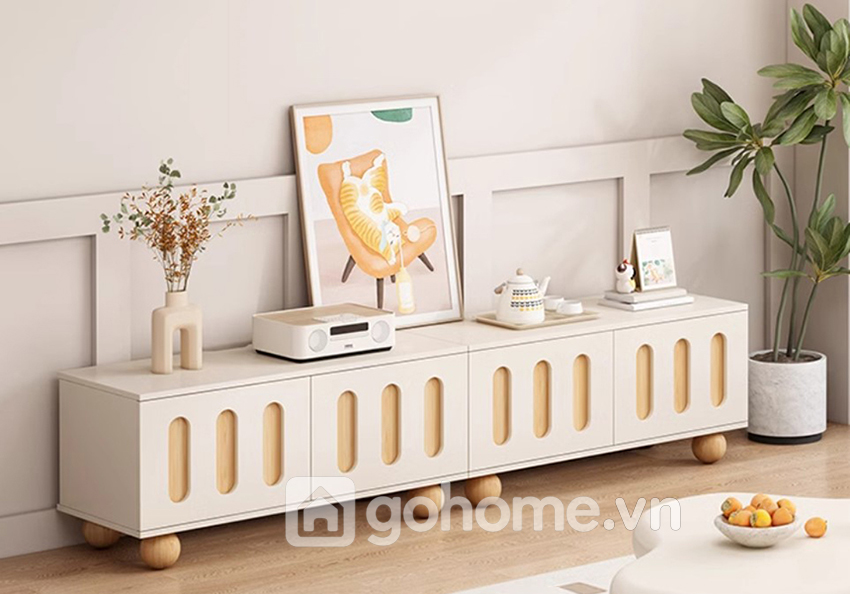 Được lấy cảm hứng từ phong cách nội thất Hàn Quốc & Scandinavian, mẫu kệ tivi nhỏ gọn chân bi tròn này gây ấn tượng mạnh mẽ với người dùng bởi ngoại hình “cute hết nấc”. Phần chân bo tròn như những quả bóng nhỏ xinh, kết hợp cùng mặt kệ phẳng, các chi tiết bo góc mềm mại và tone màu trắng kem phối gỗ sáng – tất cả tạo nên một cảm giác ấm áp, nhẹ nhàng, gần gũi.