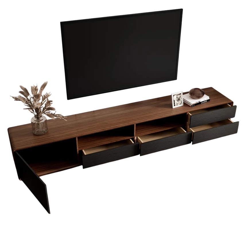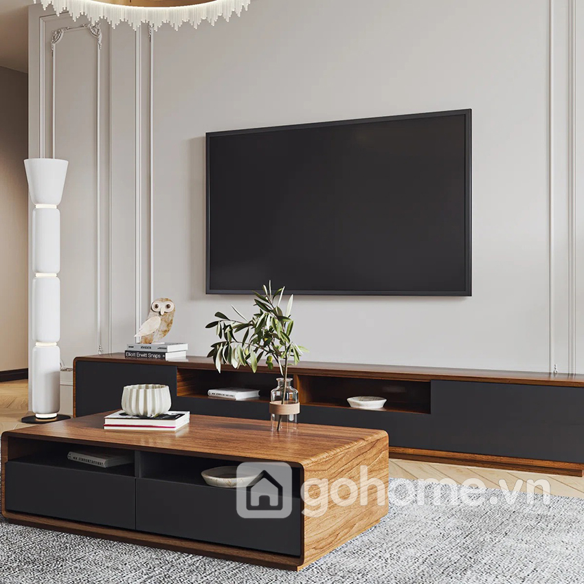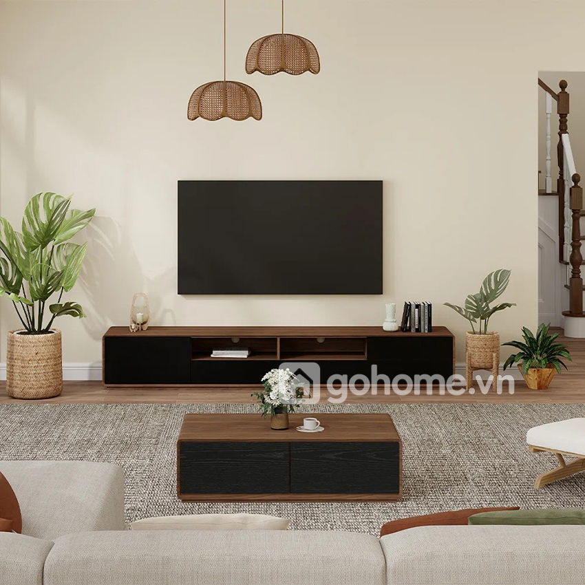 Sở hữu đường nét vuông vức, mặt kệ phẳng mịn cùng sự phối hợp màu sắc độc đáo giữa gỗ và đen mờ, mẫu kệ này mang đến cảm giác vừa ấm cúng vừa mạnh mẽ, phù hợp với nhiều phong cách nội thất hiện đại như: Scandinavian, Japandi, Minimalist hay Urban Chic.