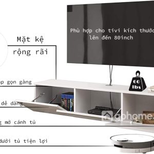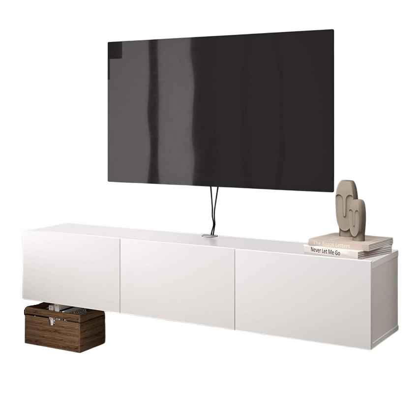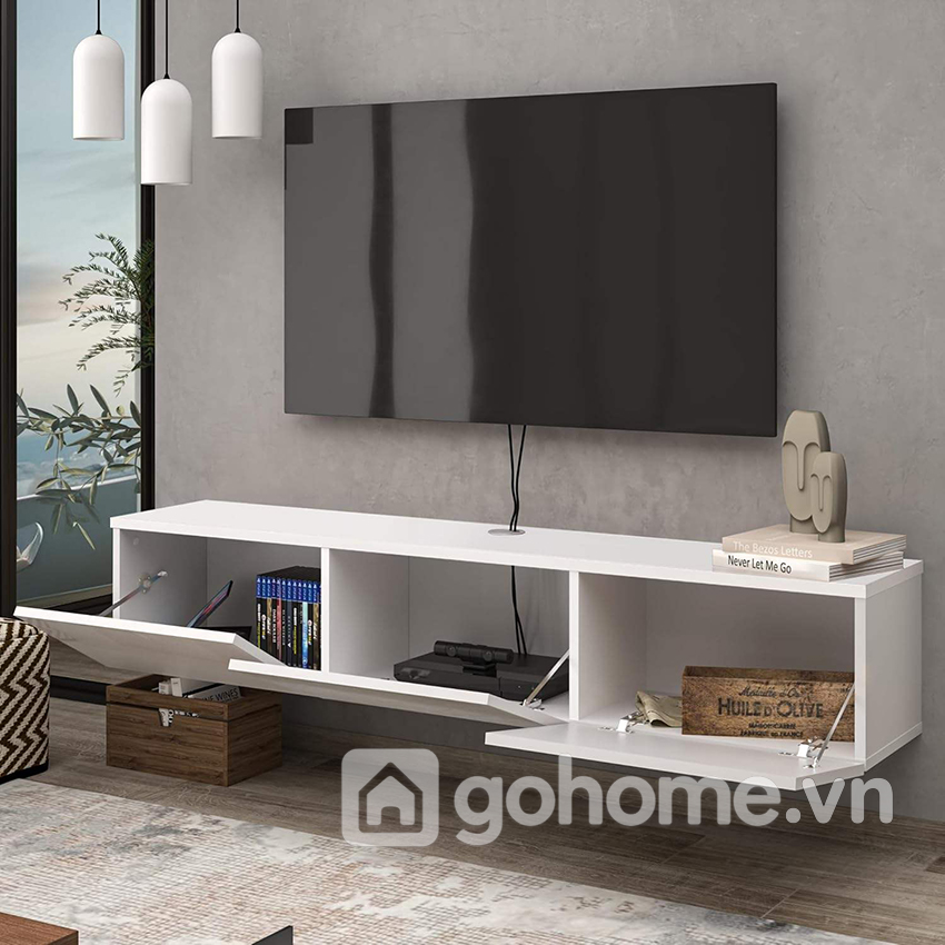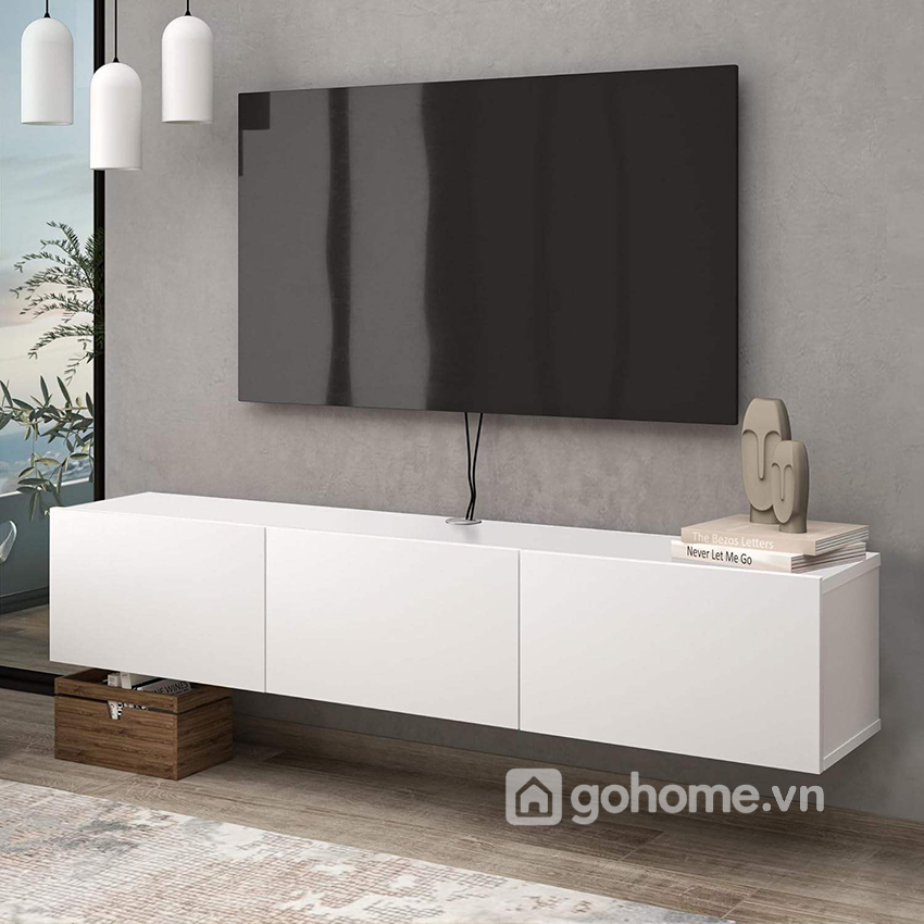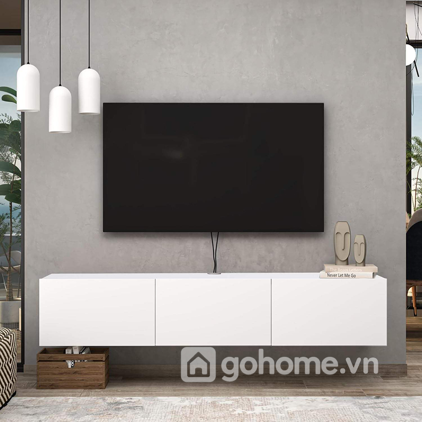 Mẫu kệ tivi treo tường thiết kế tối giản gỗ MDF chinh phục người dùng bởi kiểu dáng hình hộp vuông góc cạnh, liền mạch và không tay nắm – tạo nên sự liền khối sang trọng. Với tone màu trắng tinh tế, sản phẩm dễ dàng kết hợp với mọi không gian: từ căn hộ chung cư nhỏ, nhà phố hiện đại, đến phòng ngủ master sang trọng.