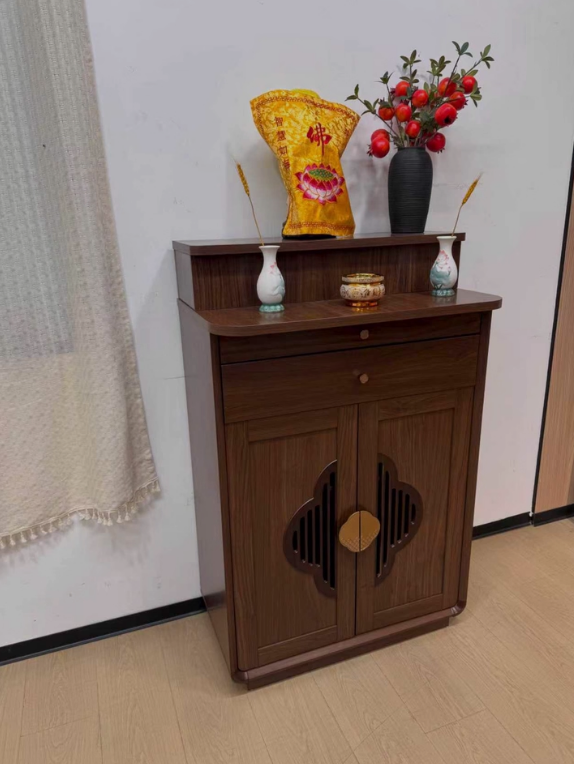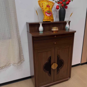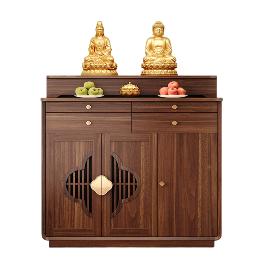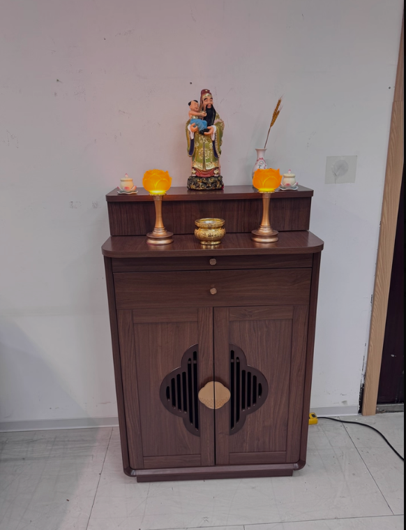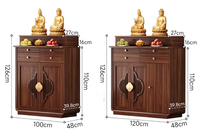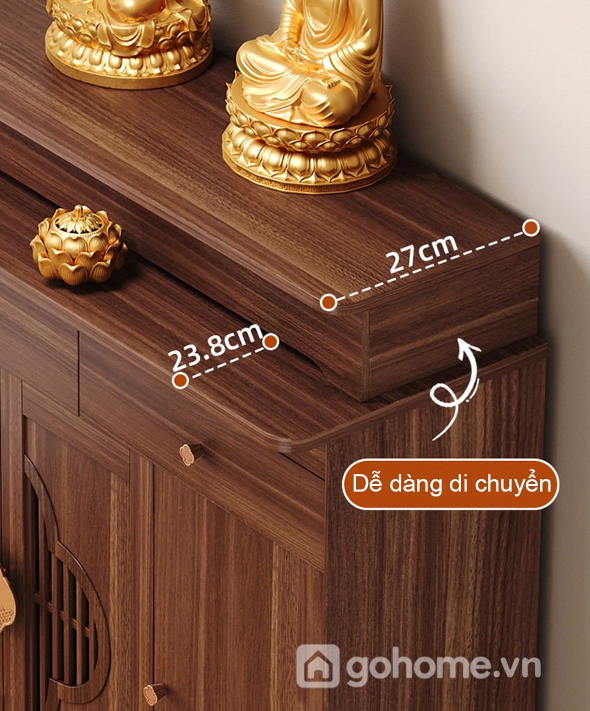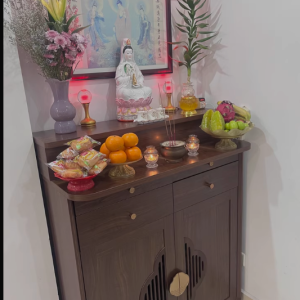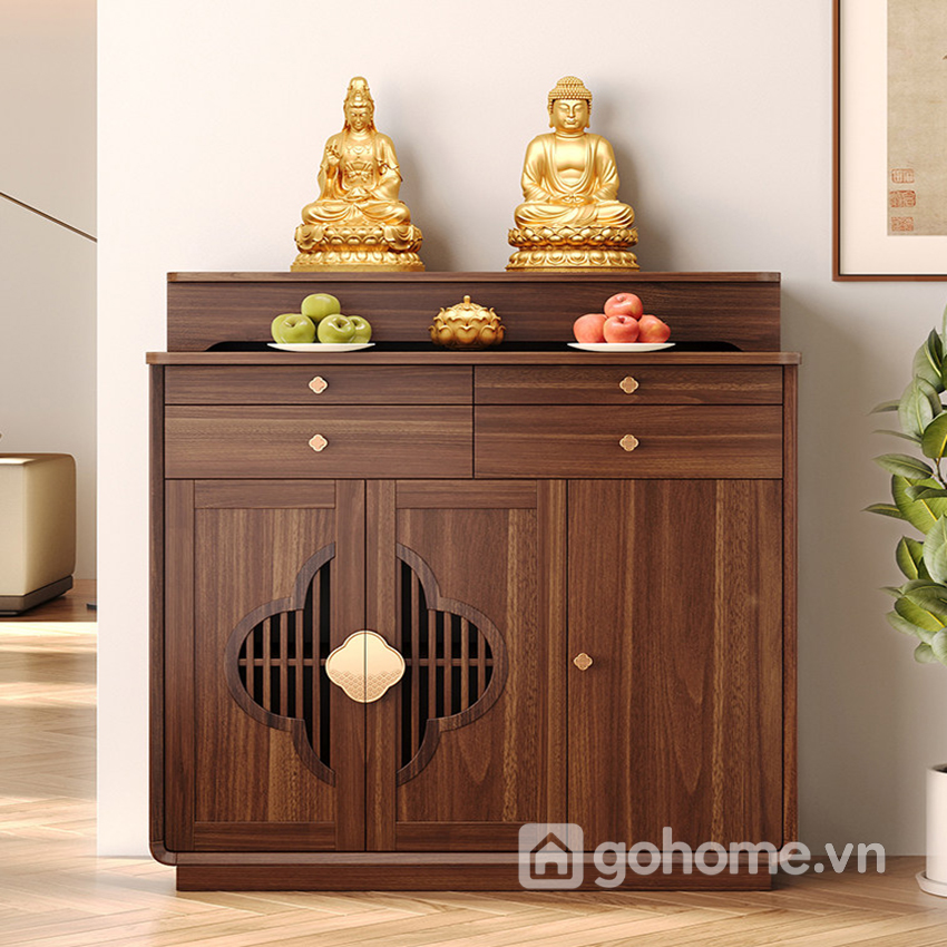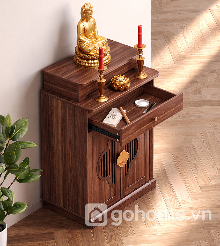 Phần mặt trên rộng rãi đủ để bố trí tượng Phật, tượng gia tiên hoặc khung ảnh thờ. Tầng bậc phía sau giúp tạo chiều cao hợp lý, tăng tính trang nghiêm cho tổng thể. Hai ngăn kéo phía trên hỗ trợ lưu trữ hương, nến, vật phẩm nhỏ gọn, giữ cho khu vực thờ luôn gọn gàng.