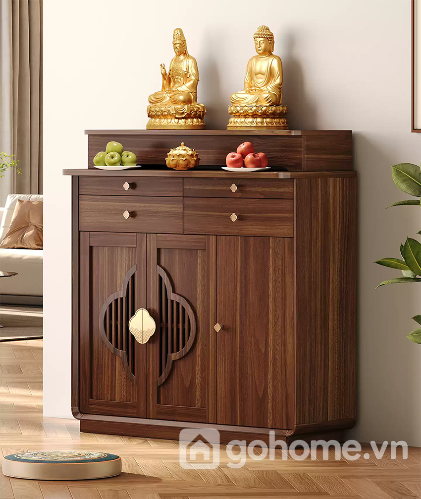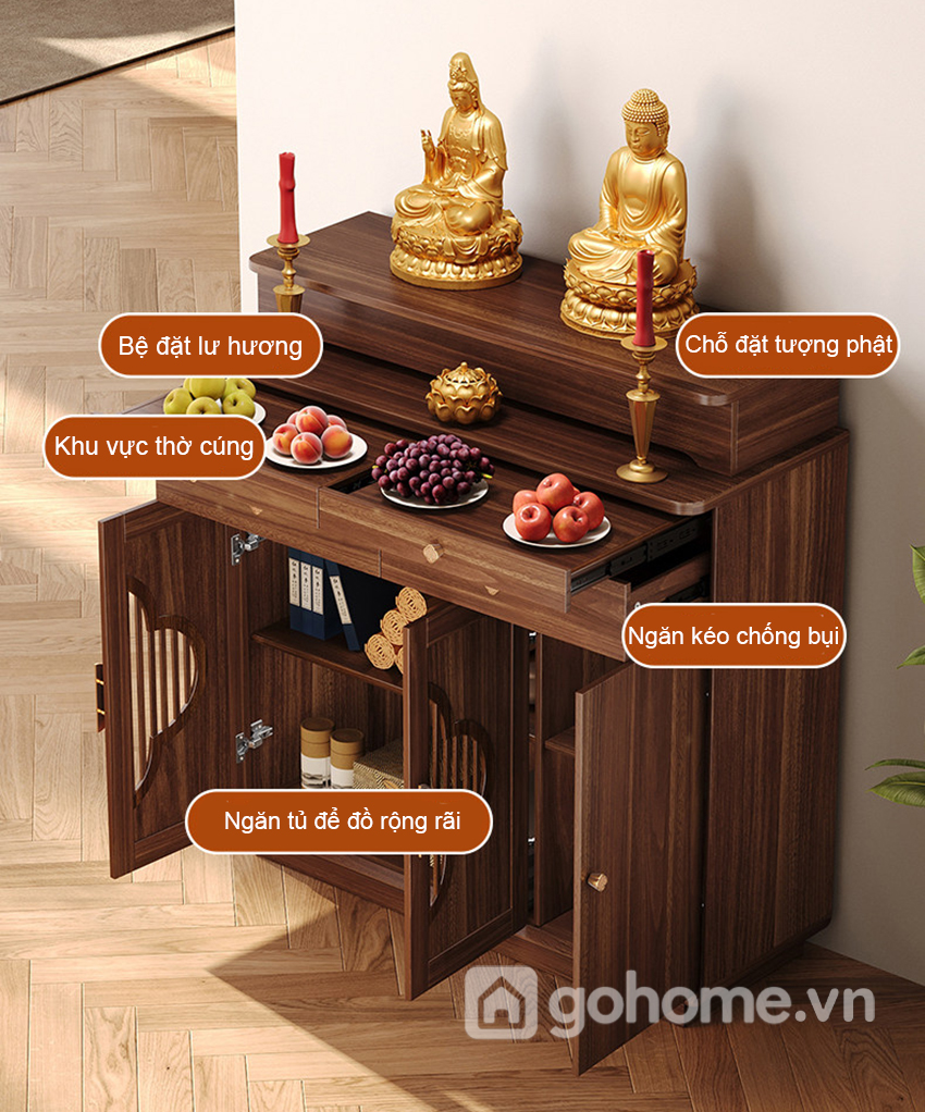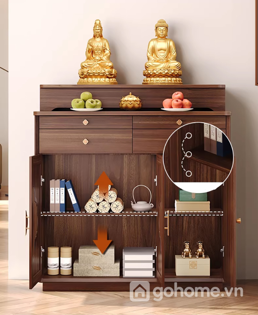Hai ngăn kéo phía trên giúp lưu trữ vật phẩm nhỏ. Khoang tủ bên dưới rộng rãi, có thể cất giữ đồ lễ, giấy tiền, vật dụng thờ cúng ít dùng.