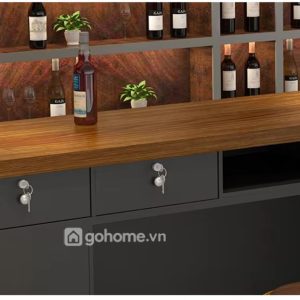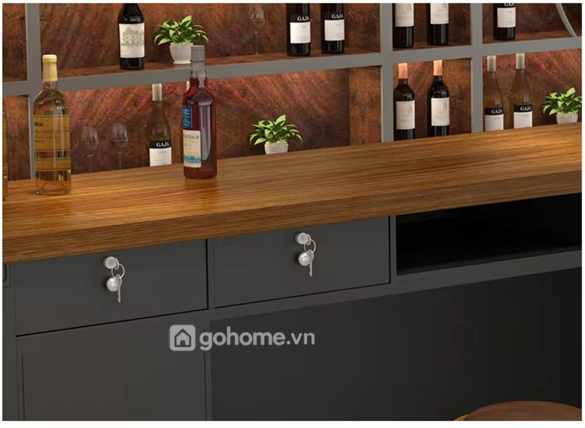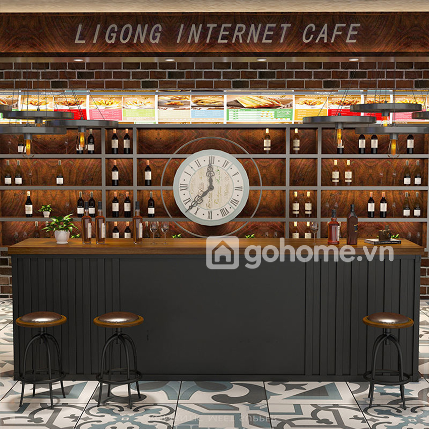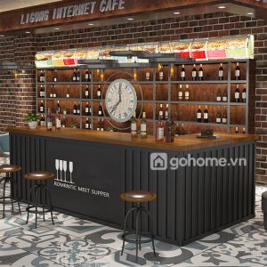 Mặt bàn gỗ tự nhiên/laminate vân sồi: dễ lau chùi, chống trầy nhẹ, chịu lực tốt – đặt được nhiều vật dụng như máy POS, bình lắc cocktail, chai rượu, máy pha chế…