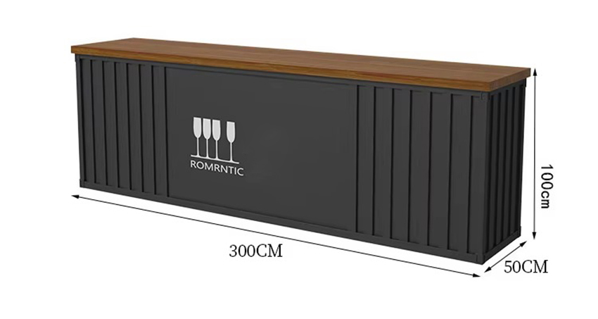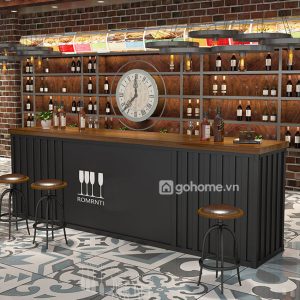 Mặt trước quầy được ốp các thanh gỗ đứng đối xứng, tạo chiều sâu và sự phá cách. Logo “ROMRNTI” (có thể tùy biến theo thương hiệu) được in nổi hoặc khắc CNC kết hợp đèn LED hắt nhẹ giúp tăng độ nhận diện thương hiệu cực tốt trong ánh sáng ban đêm của quầy bar.