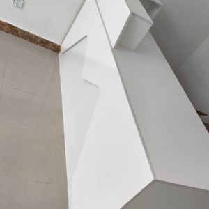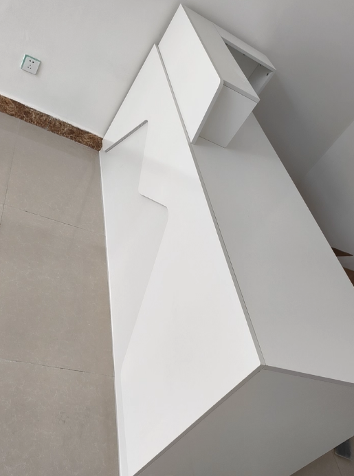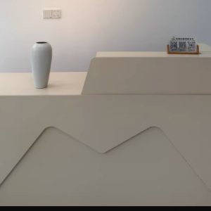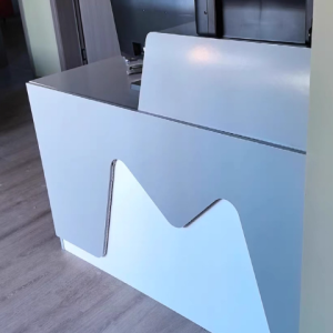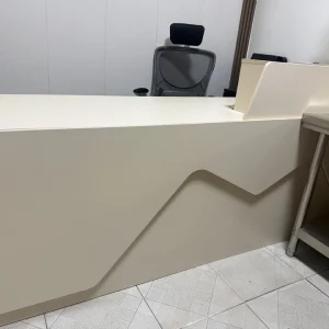 Điểm nổi bật nhất của quầy lễ tân gỗ công nghiệp thiết kế độc đáo chính là phần mặt trước tạo hình lượn sóng mềm mại. Thay vì các mảng phẳng quen thuộc, thiết kế này mang lại cảm giác chuyển động, nghệ thuật và đầy cá tính.