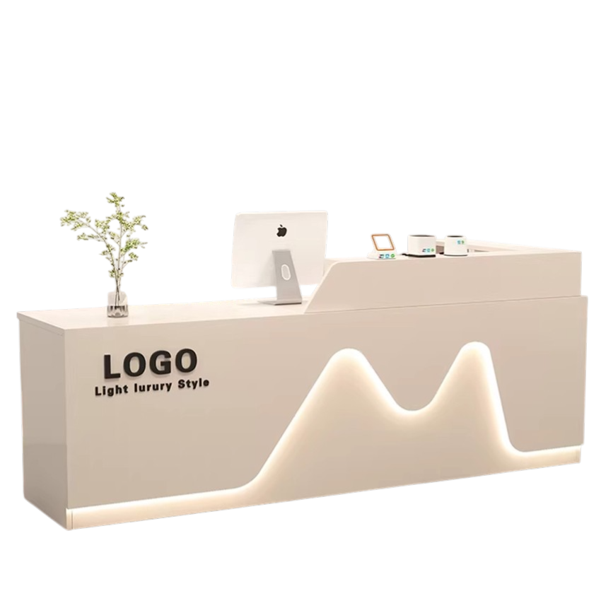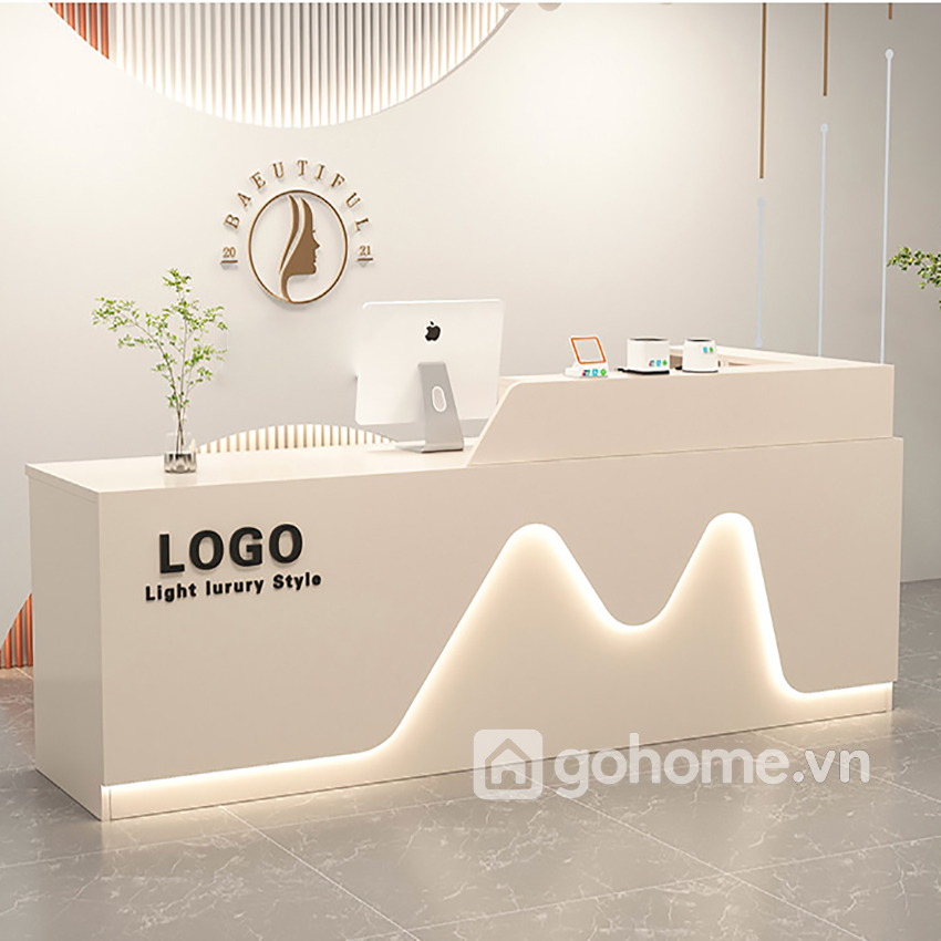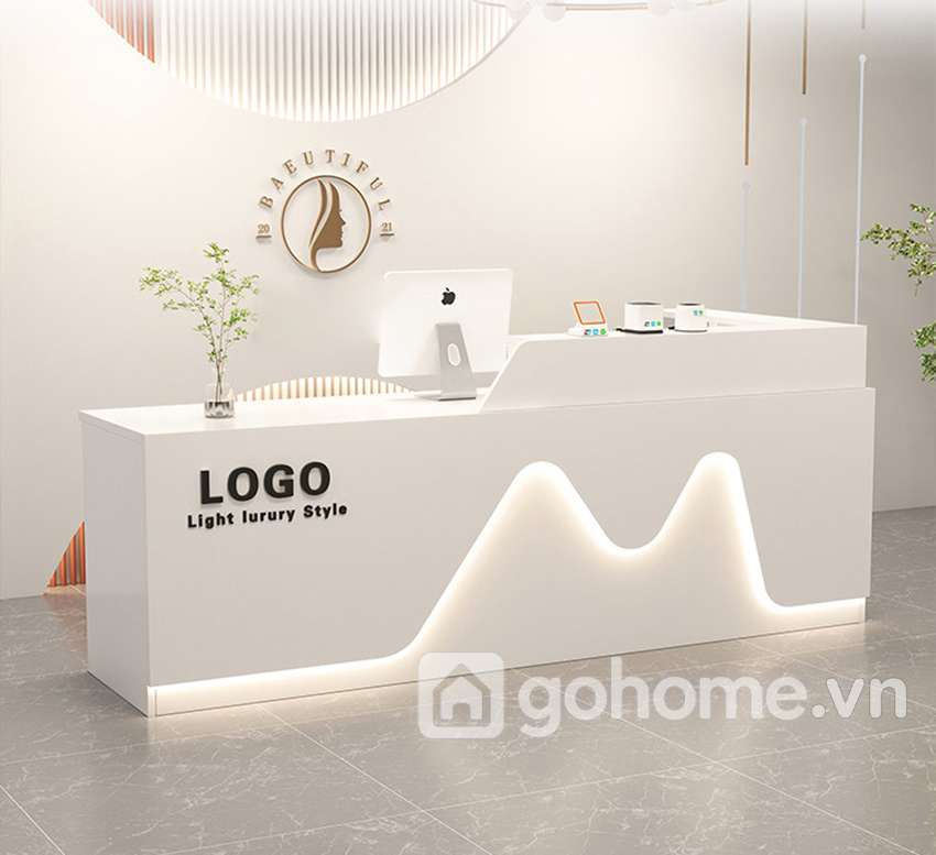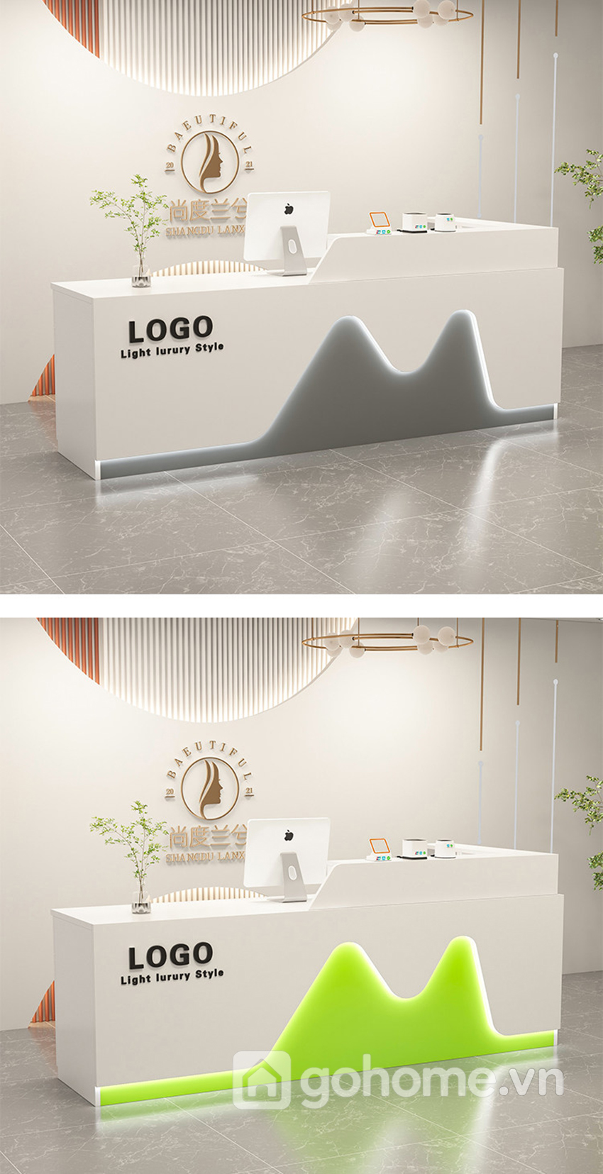 Mẫu quầy trong hình gây thu hút ngay lập tức nhờ thiết kế phá cách với mảng uốn lượn tạo hình như dãy núi mềm mại phía trước. Đặc biệt, hệ đèn LED đổi màu (trắng – xanh nổi bật) giúp không gian trở nên sống động và hiện đại hơn bao giờ hết. Phong cách light luxury kết hợp cùng gam màu trắng tinh tế mang lại vẻ đẹp thanh lịch, trẻ trung nhưng vẫn sang trọng.
