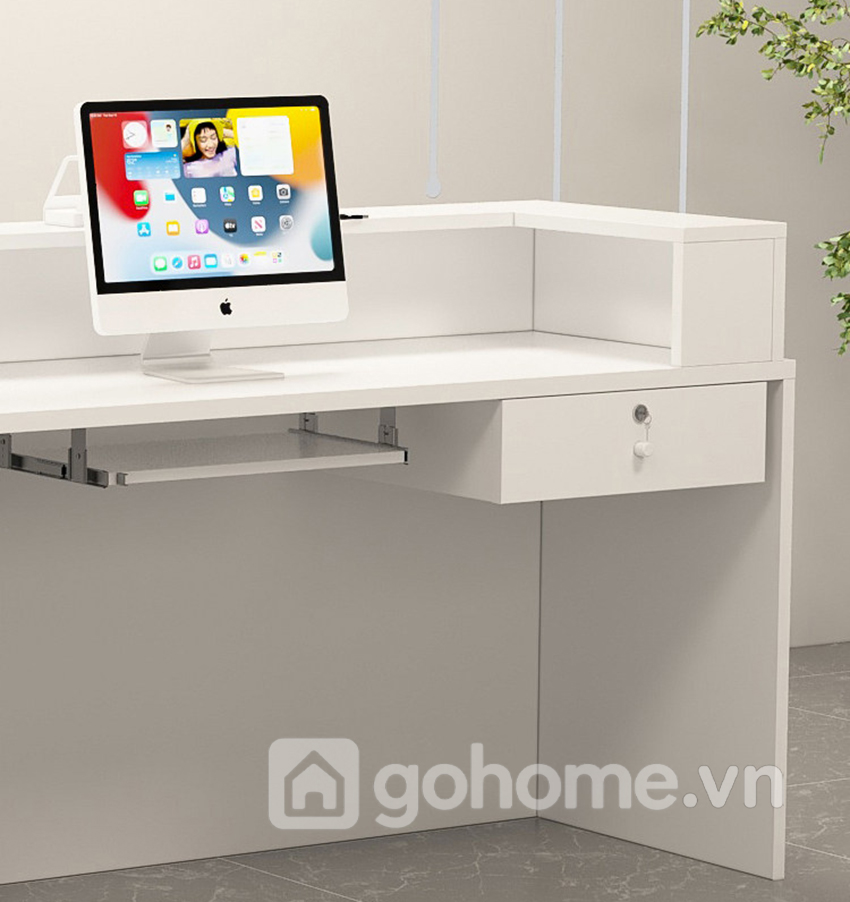 Bên cạnh yếu tố thẩm mỹ, quầy vẫn đảm bảo đầy đủ công năng sử dụng. Mặt bàn rộng rãi để bố trí máy tính, máy POS, tài liệu và vật dụng trang trí.