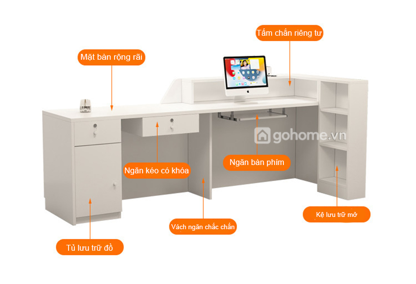 Bạn có thể tham khảo thêm các mẫu quầy lễ tân đẹp, quầy lễ tân chữ L, bàn tiếp tân gỗ MDF hiện đại tại GOHOME.VN để lựa chọn giải pháp phù hợp với diện tích và concept không gian của mình.